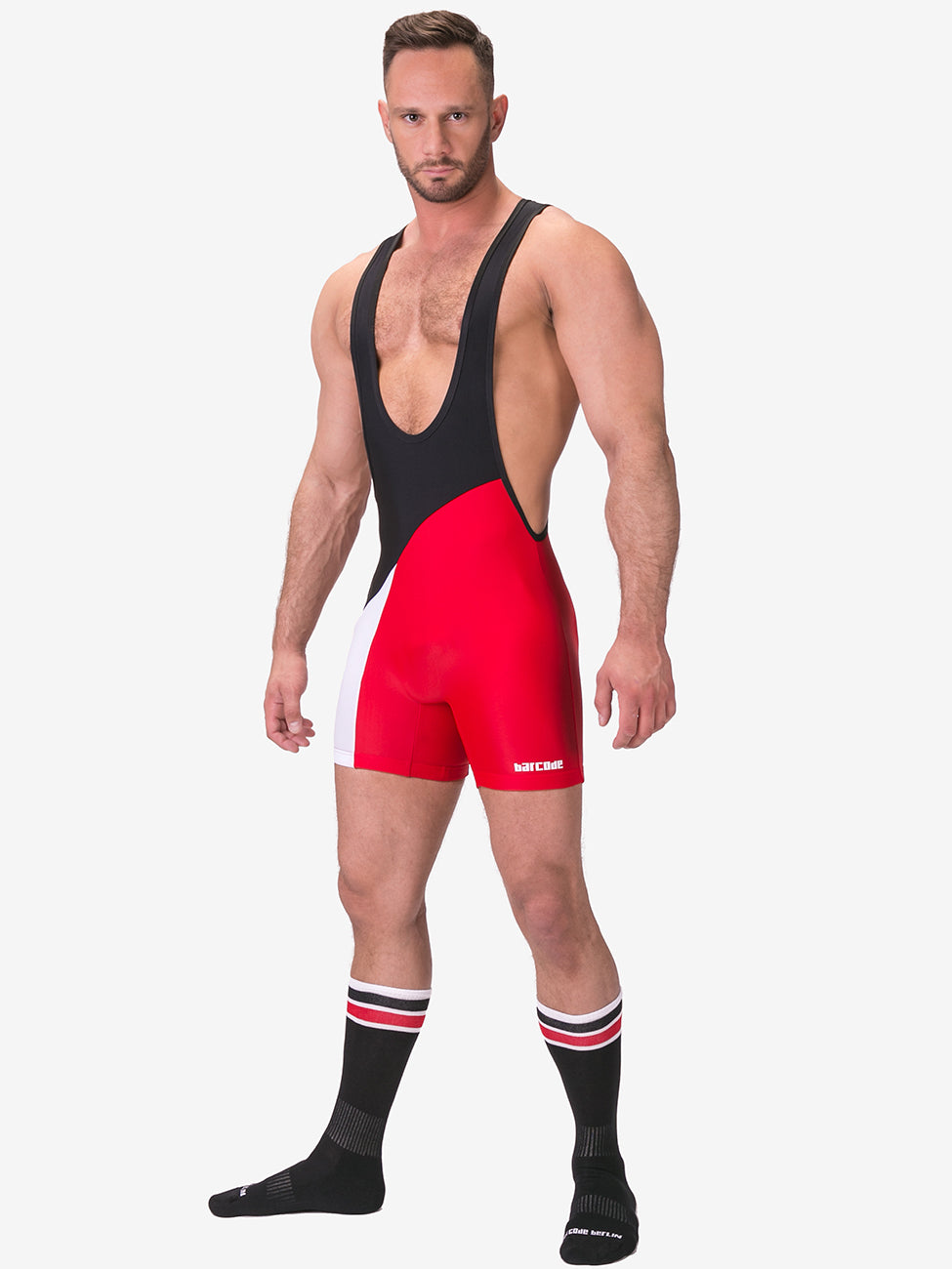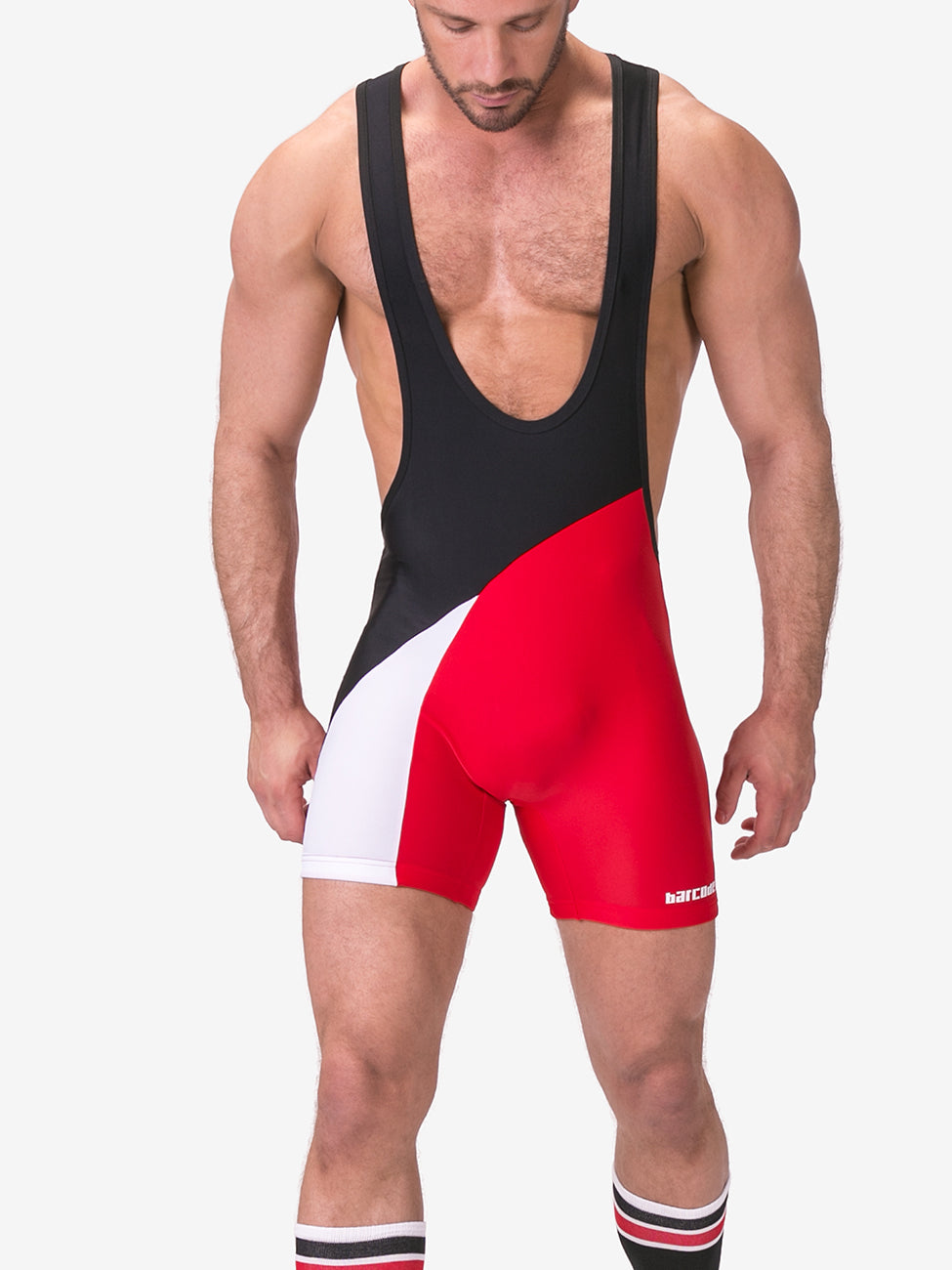 Dieses Singlet besticht durch eine auffällige Kombination farbenfroher Einsätze, die für eine auffällige Wrestling-Anzug-Ästhetik sorgen. Die Liebe zum Detail zeigt sich im kontrastierenden Abschlussband, das dem Gesamtdesign eine dynamische Note verleiht.