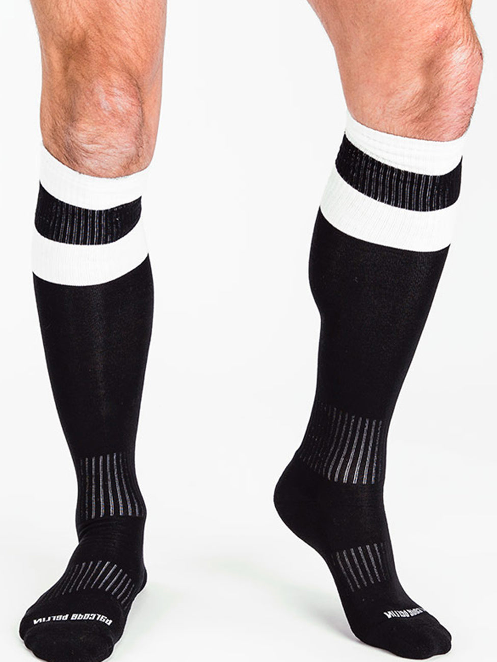 Die Barcode Berlin Fußballsocken in Schwarz und Weiß eignen sich hervorragend für den Sport oder einfach zum Spazierengehen in der Stadt.