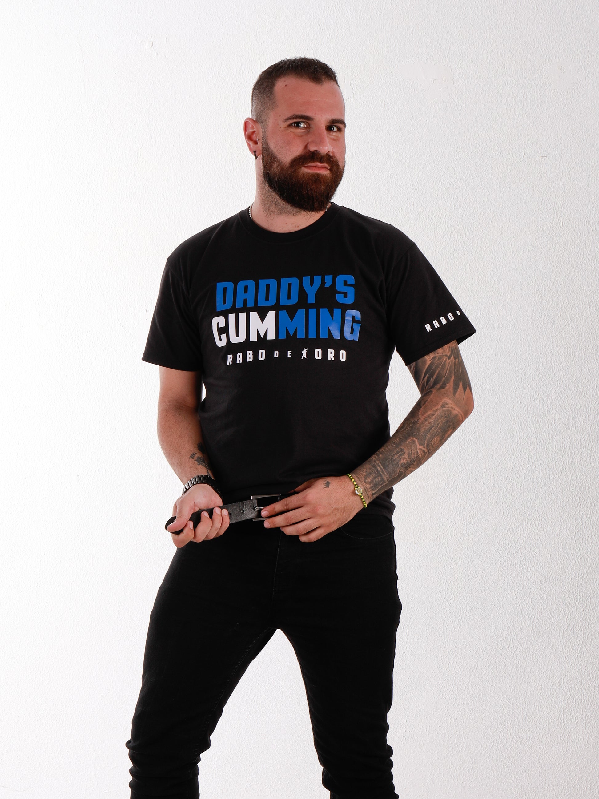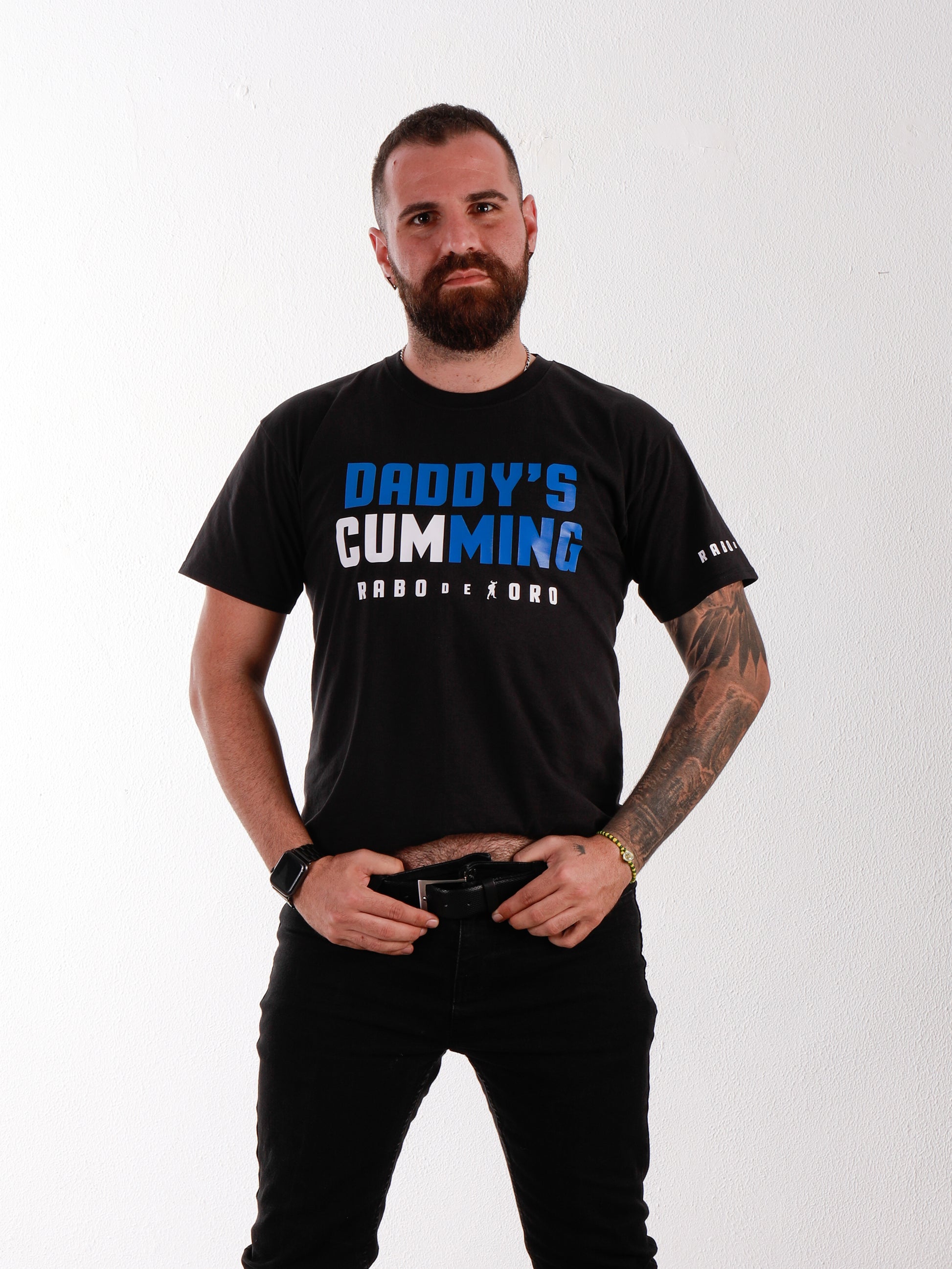 Schwarzes Gay-Streetwear-T-Shirt „DADDY's CUMMING“ mit blauen und weißen Details.