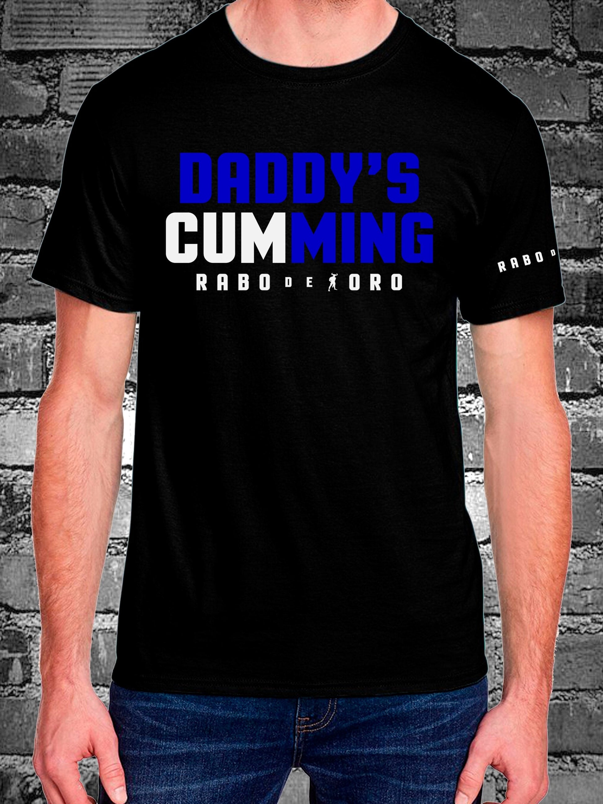 Vorne in der Mitte positioniertes DADDY'S CUMMING-Design in fetten BLAUEN Buchstaben mit CUM in kontrastierenden WEISSEN Buchstaben. Weißes Rabo de Toro-Logo vorne in der Mitte und auf dem linken Ärmel.