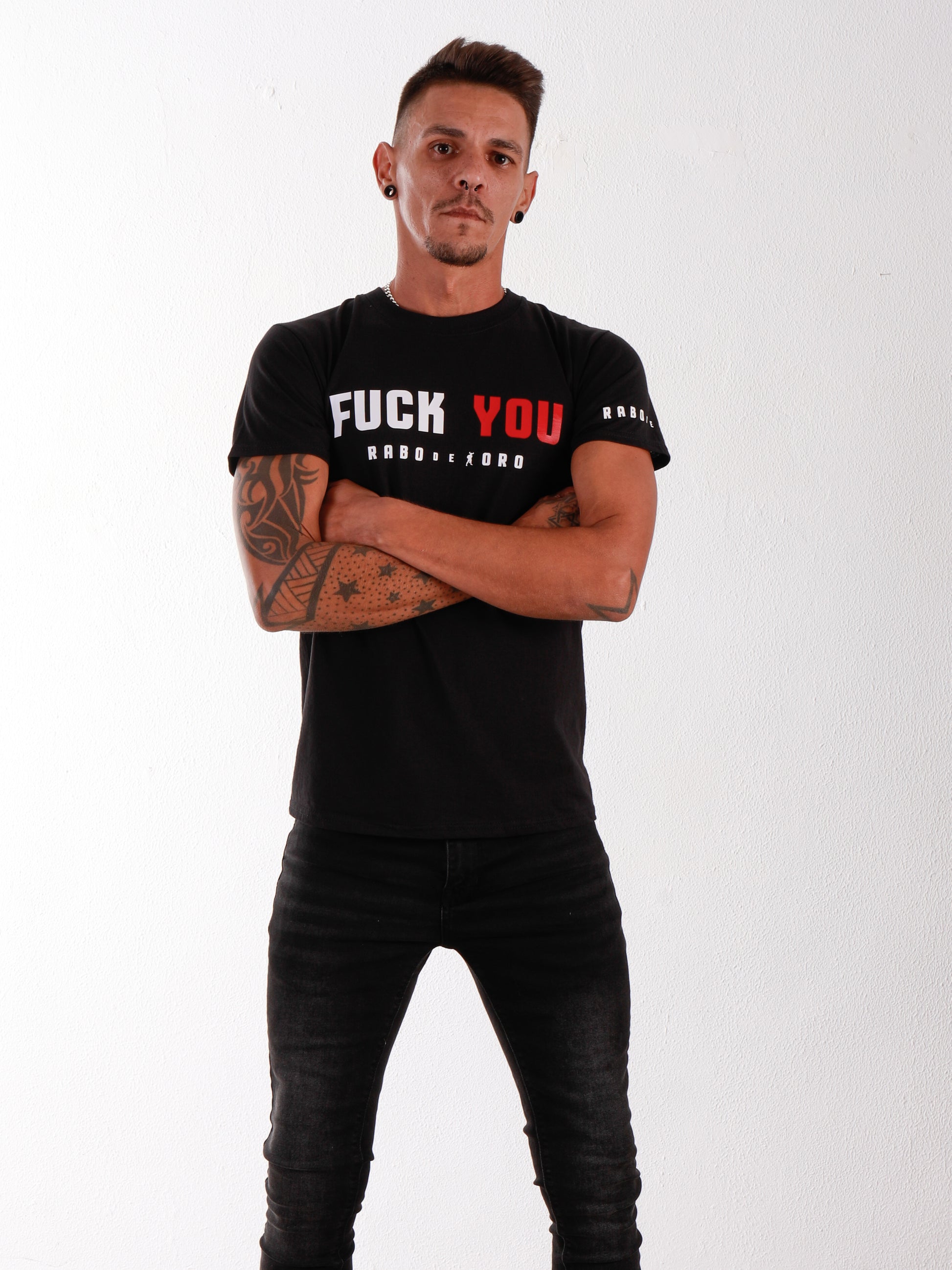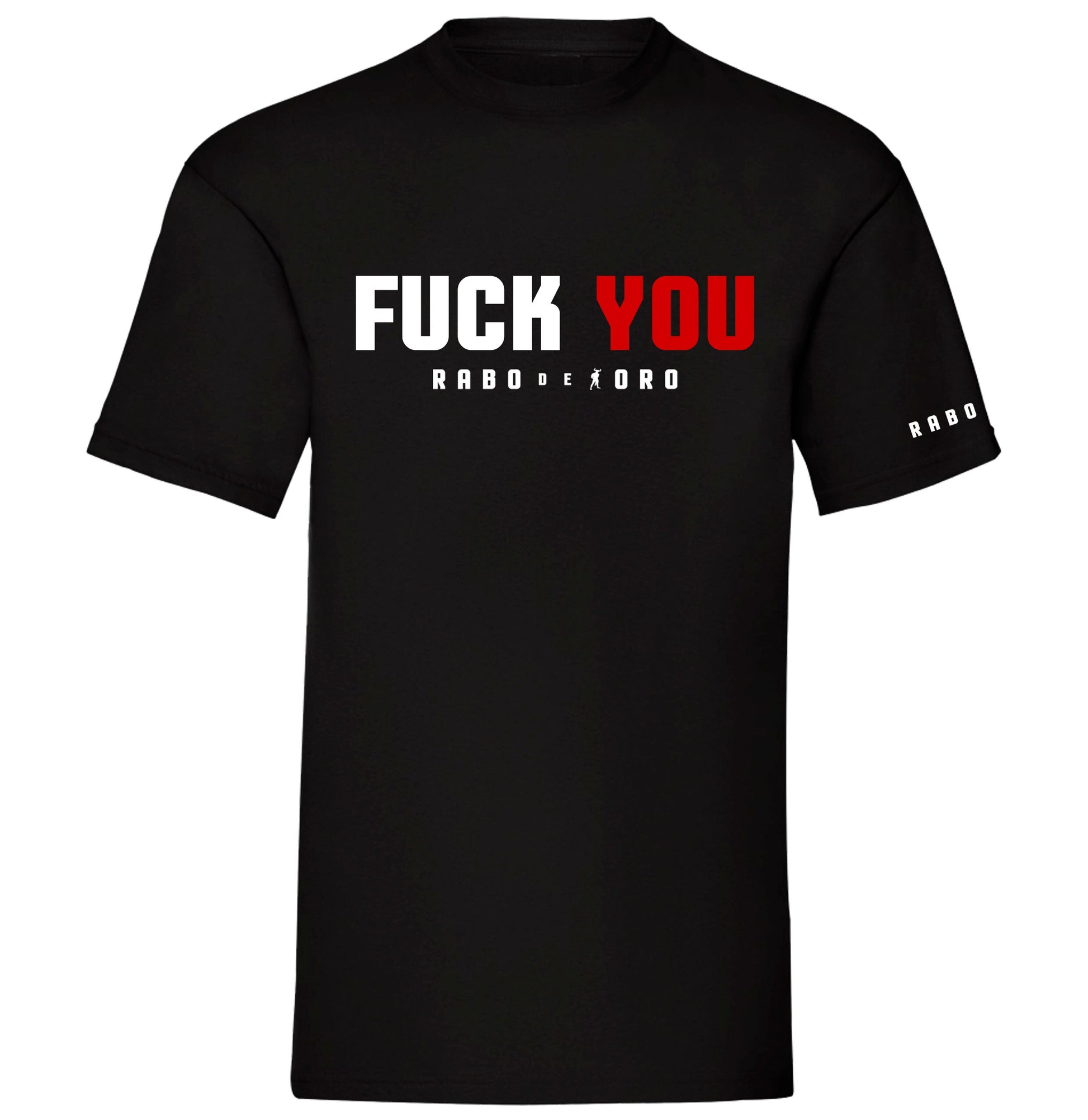 Dieses T-Shirt ist beidseitig gestaltet! VORDERSEITE: Vorne in der Mitte „FUCK“ in fetten WEISSEN Buchstaben und „DU“ in fetten ROTEN Buchstaben. Weißes Rabo de Toro-Logo vorne in der Mitte und auf dem linken Ärmel. RÜCKSEITE: Oben in der Mitte „FUCK“ in fetten ROTEN Buchstaben und „ME“ in fetten WEISSEN Buchstaben. Weißes Rabo de Toro-Logo hinten in der Mitte.