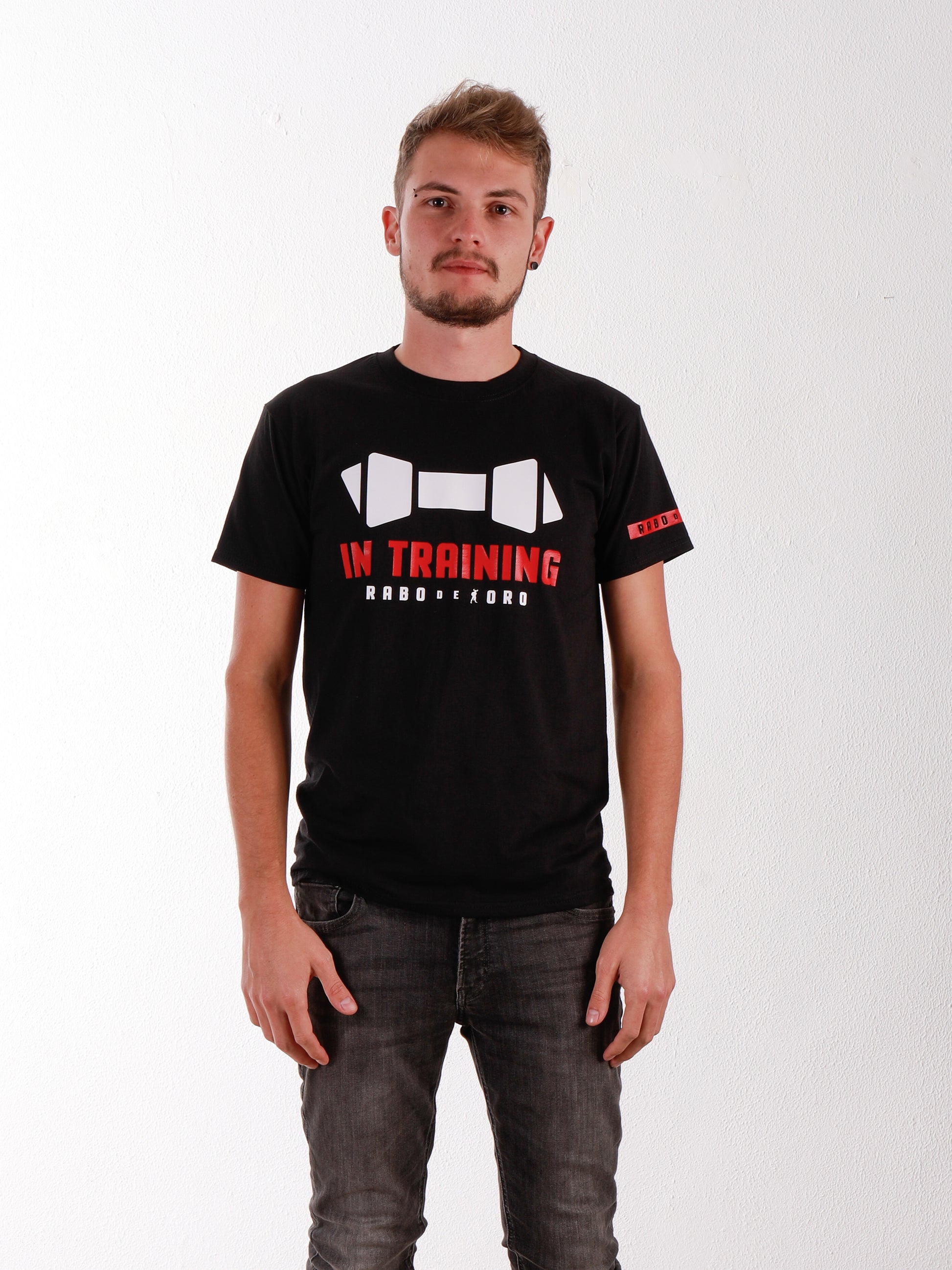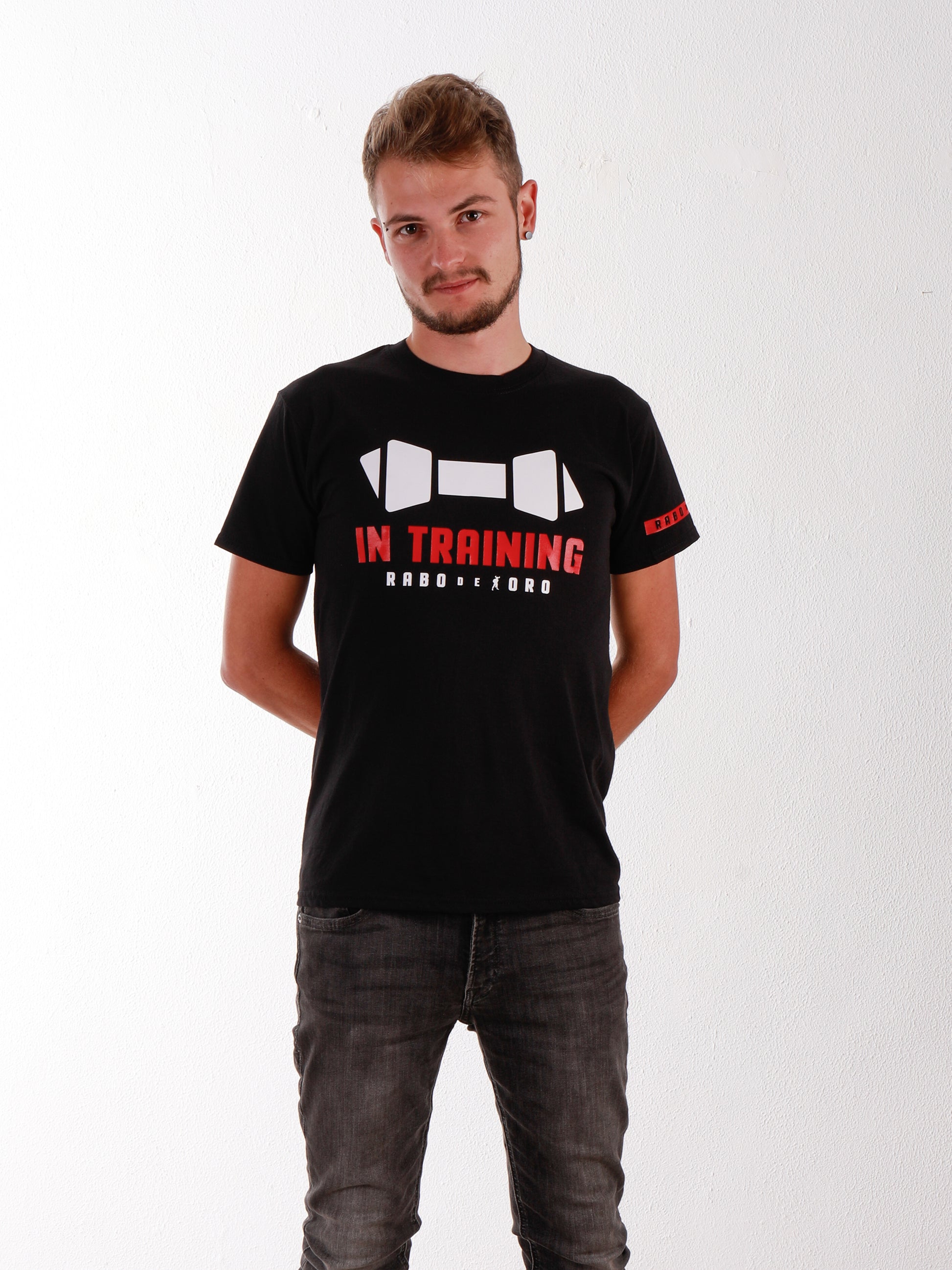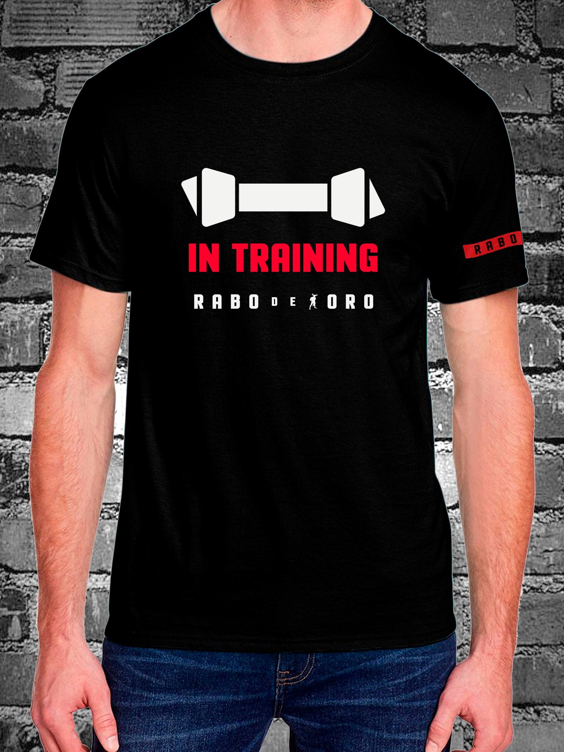 Weißes Puppy Play BONE-Detail vorne in der Mitte und der Schriftzug „IN TRAINING“ in roten Buchstaben. Weißes Rabo de Toro-Logo vorne in der Mitte. Roter Streifen mit Rabo de Toro-Logo in Kontrastfarbe auf dem linken Ärmel.