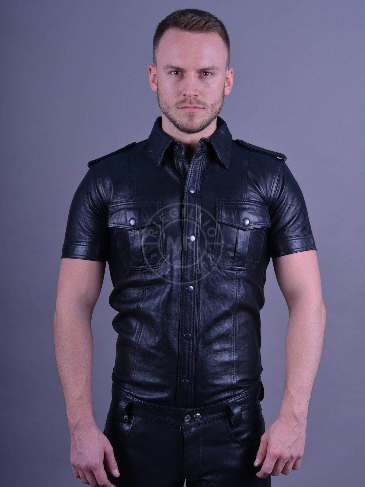 Dieses taillierte Hemd aus schwarzem Leder hat kurze Ärmel, schwarze Knöpfe, Schulterklappen und zwei Brusttaschen.