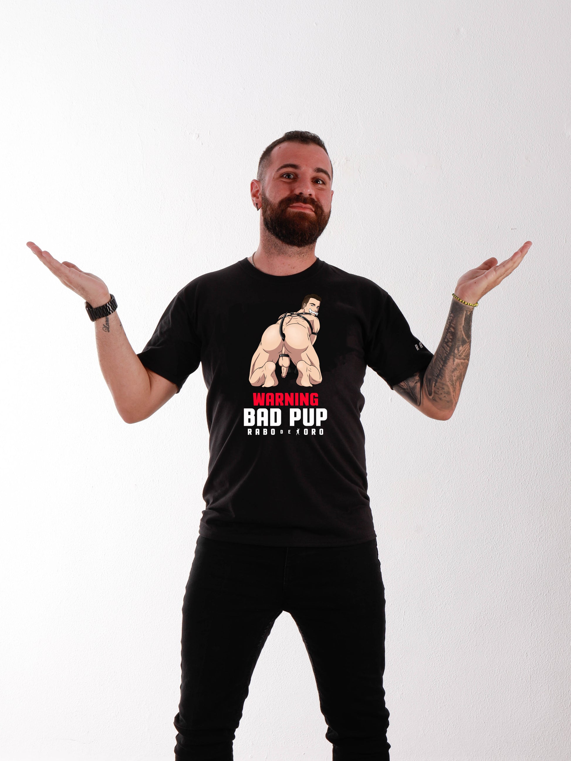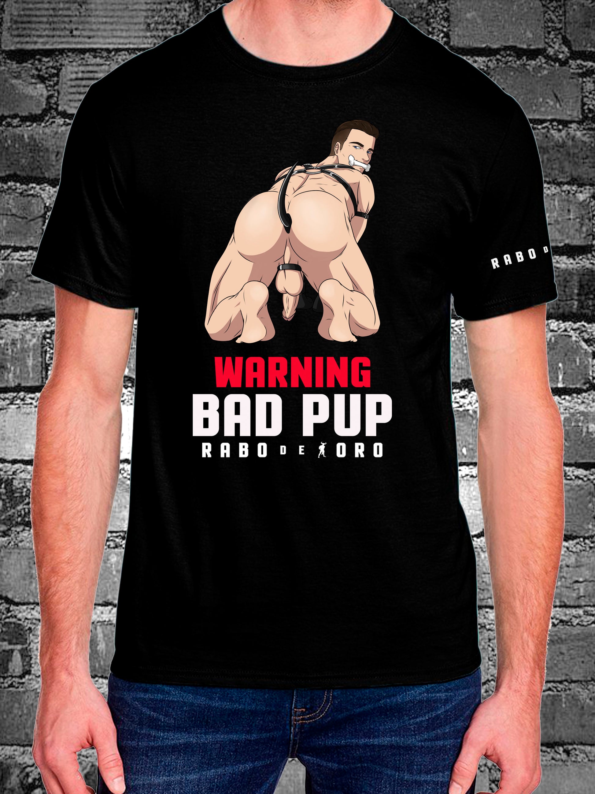 WARNUNG BAD PUP Gay Herren BDSM Fetisch Club Schwarzes T-Shirt mit Welpen-Cartoon-Detail