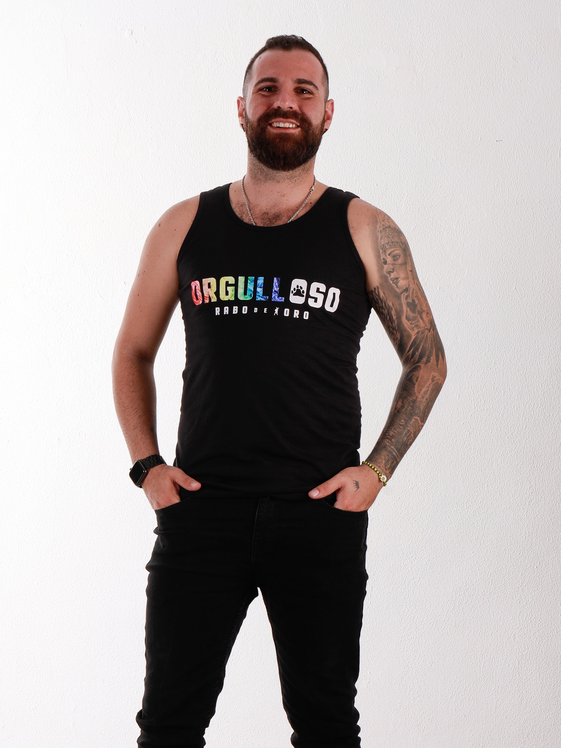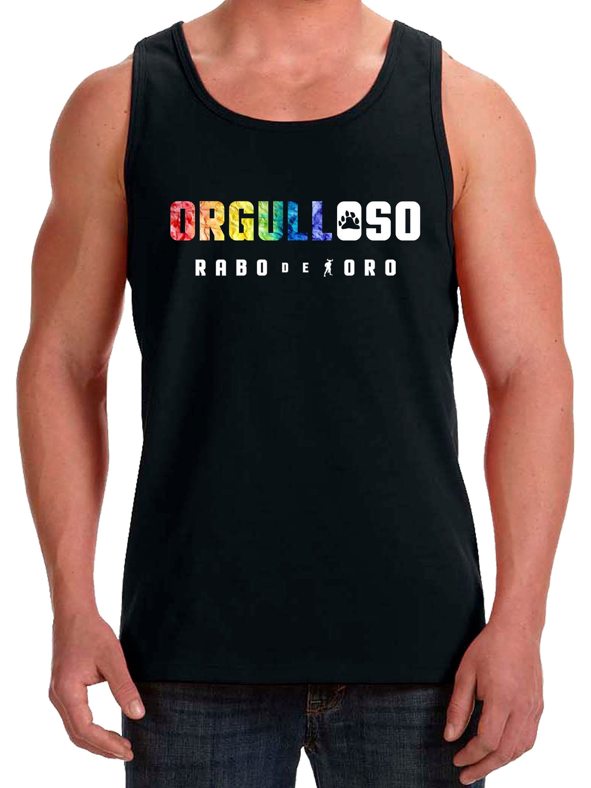 Vorne in der Mitte steht ORGULLOSO in fetten ROTEN Buchstaben mit OSO in kontrastierenden WEISSEN Buchstaben und einem schwarzen BÄRENTATZEN-Symbol auf dem ersten O. ORGULLOSO ist ein weiteres Tanktop-Modell, das wir für die spanische und lateinamerikanische Gay-Bear-Community erstellt haben!