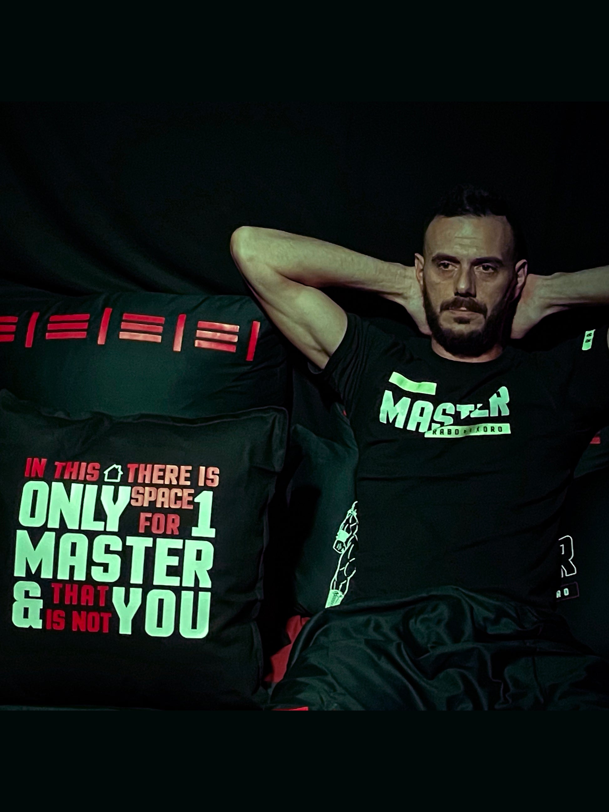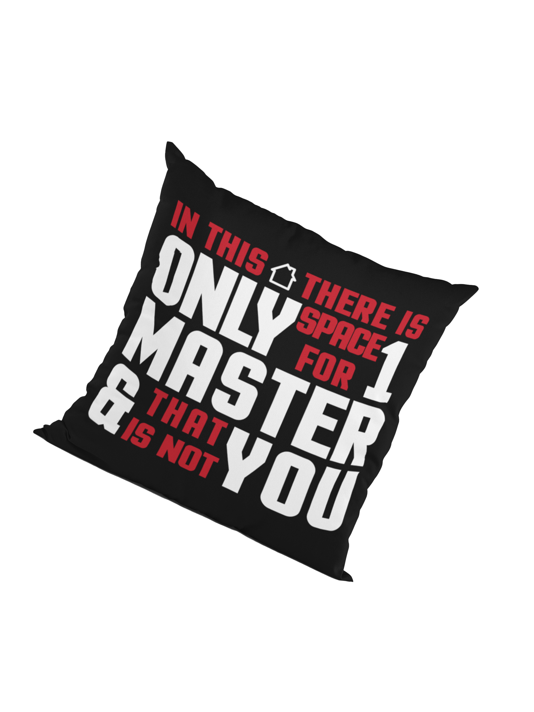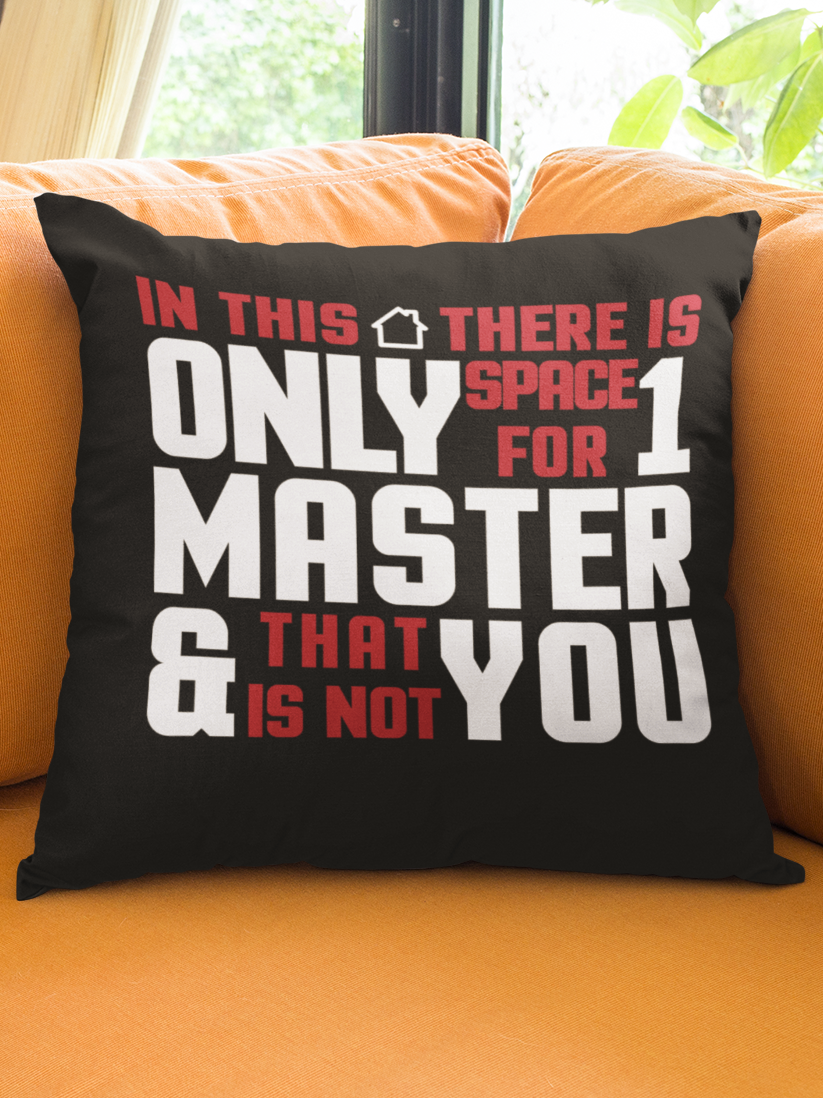 Mitten drauf prangt die Ansage "IN THIS HOUSE THERE IS ONLY SPACE FOR ONE MASTER AND THAT IS NOT YOU" in klarem Weiß und Rot – ohne jeden Zweifel, wer hier das Sagen hat. Jeder Blick verstärkt deine Herrschaft.