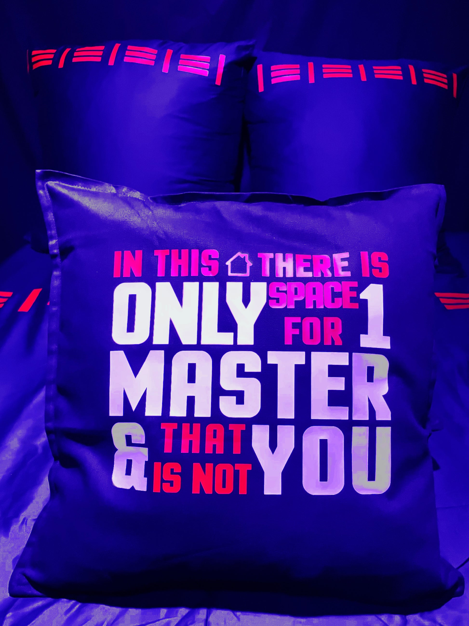 Beherrsche dein Reich mit dem "IN THIS HOUSE THERE IS ONLY SPACE FOR ONE MASTER AND THAT IS NOT YOU" (In diesem Haus ist nur Platz für einen Herrn, und das bist nicht du.) Kissenbezug von Rabo de Toro. Für den ultimativen Alpha geschaffen, vereint dieses Statement-Piece kompromisslose Typografie, Premium-Fetisch-Materialien und pure Dom-Energie.