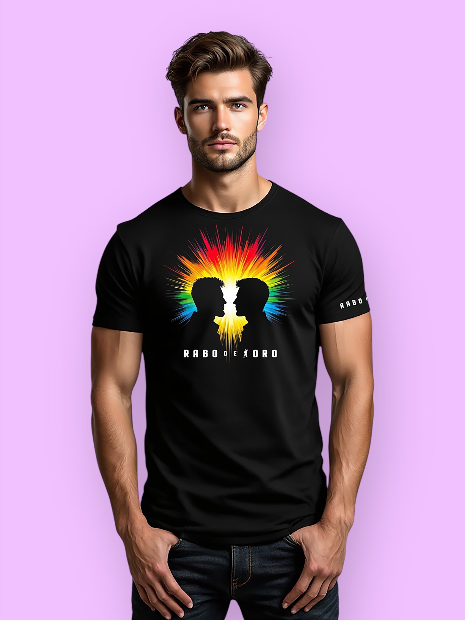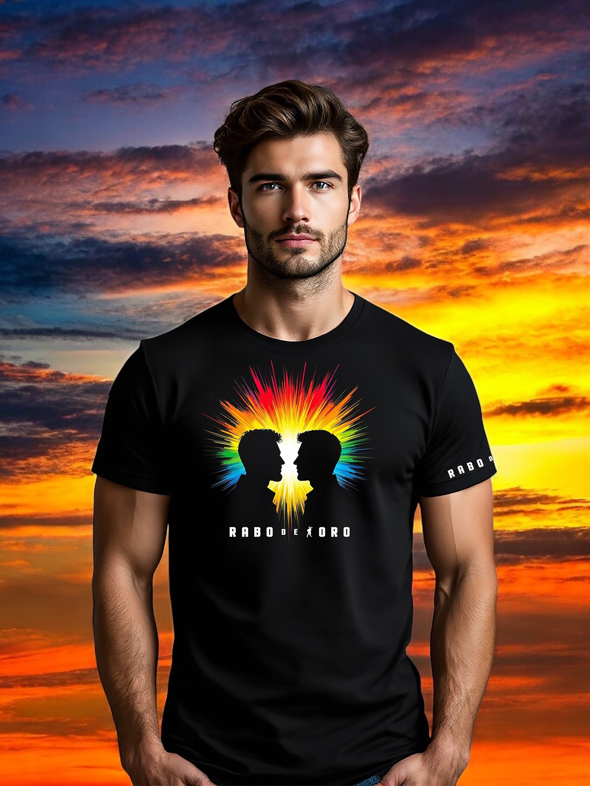 - Exklusives Gay Wear-Design: Kraftvolle Silhouetten von Männergesichtern mit einer dynamischen Regenbogenexplosion im Hintergrund, begleitet von einer mutigen Botschaft.