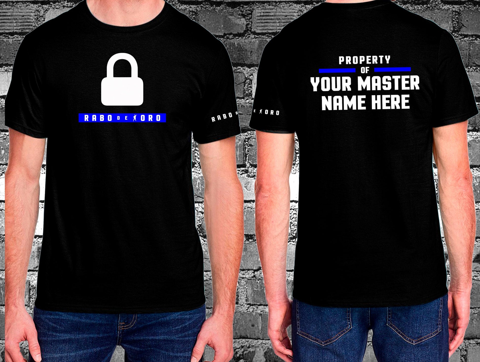 Weißes Rabo de Toro-Logo vorne in der Mitte und auf dem linken Ärmel. RÜCKSEITE: Mittig positionierter Text „PROPERTY OF“ in weißer Farbe und dunkelblauen Grafiklinien + Ihr eigener Text (Name des Meisters) in weißen Buchstaben darunter.