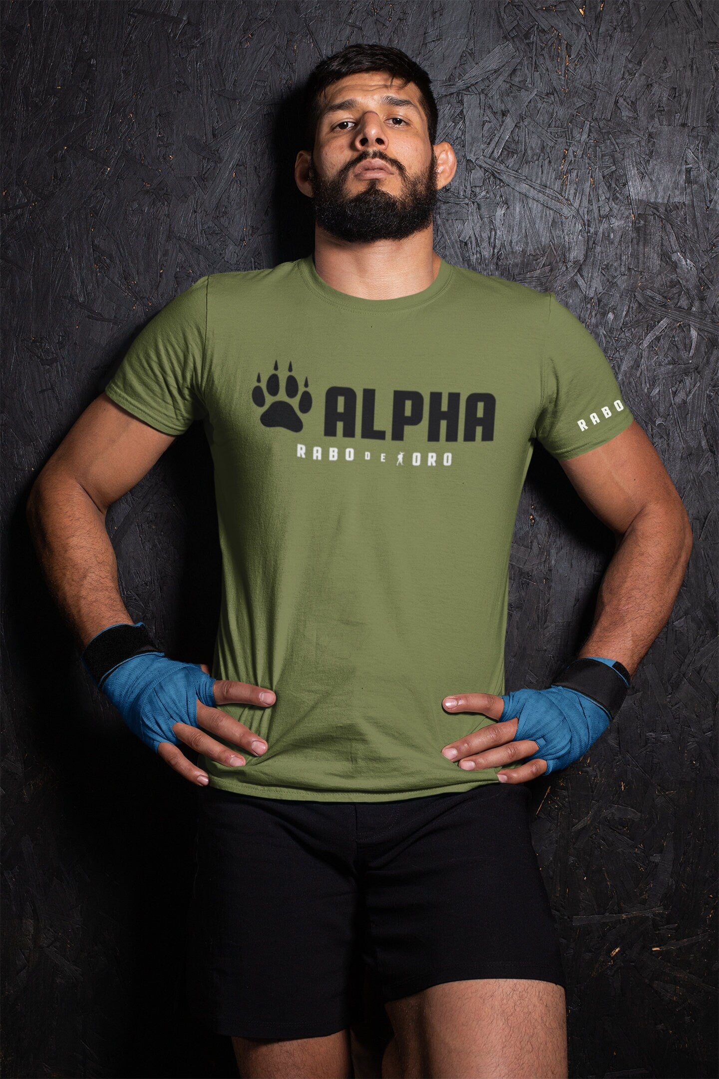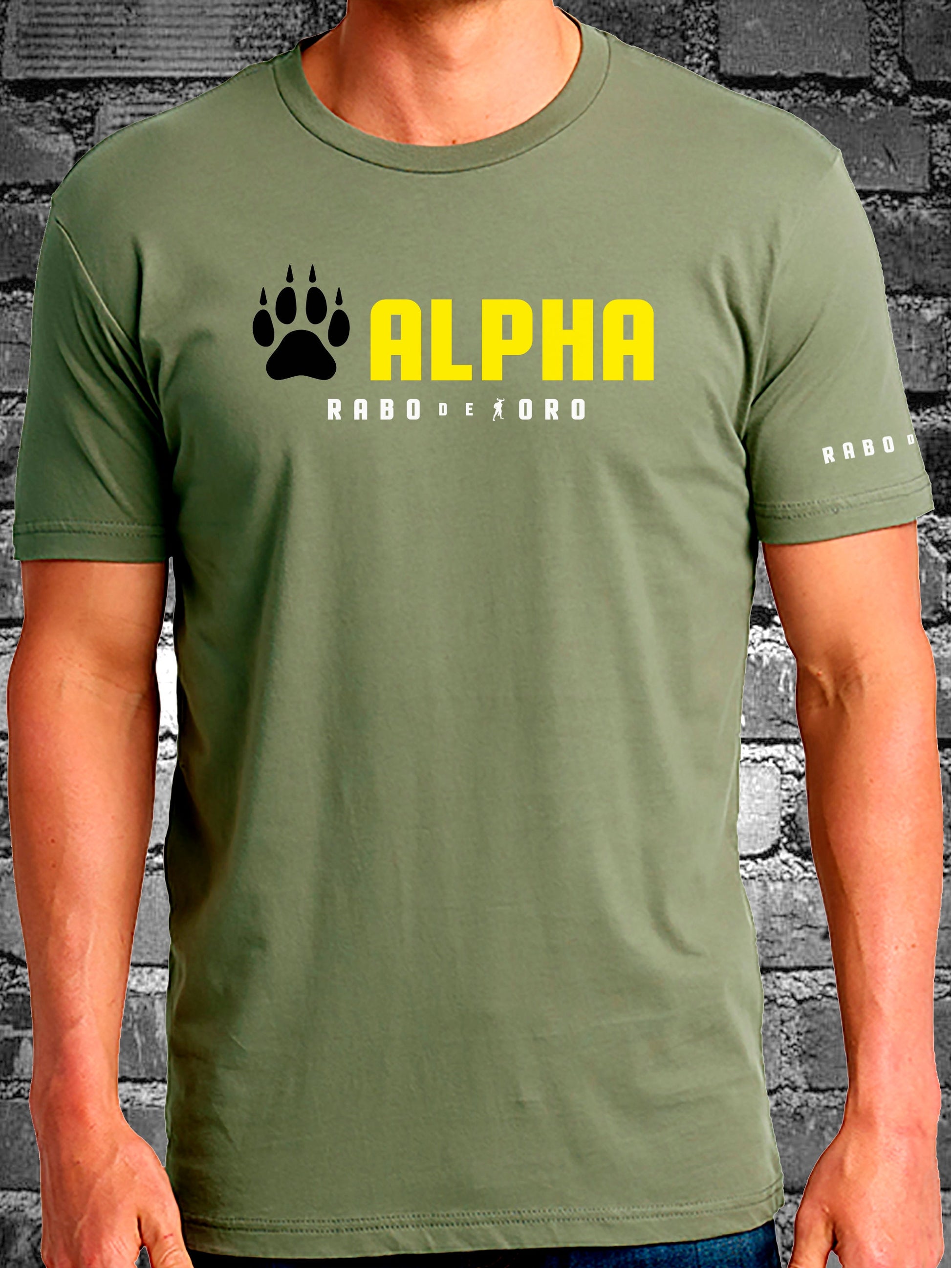 Handgefertigt auf Bestellung aus umweltfreundlichen, OEKO-TEX-zertifizierten Materialien. Das Design vorne in der Mitte enthält das Wort ALPHA in drei Farbvarianten (WEISS, SCHWARZ ODER GELB) und die WOLFSPFOTE in SCHWARZ. Das weiße Rabo de Toro-Logo befindet sich vorne in der Mitte und auf dem linken Ärmel.