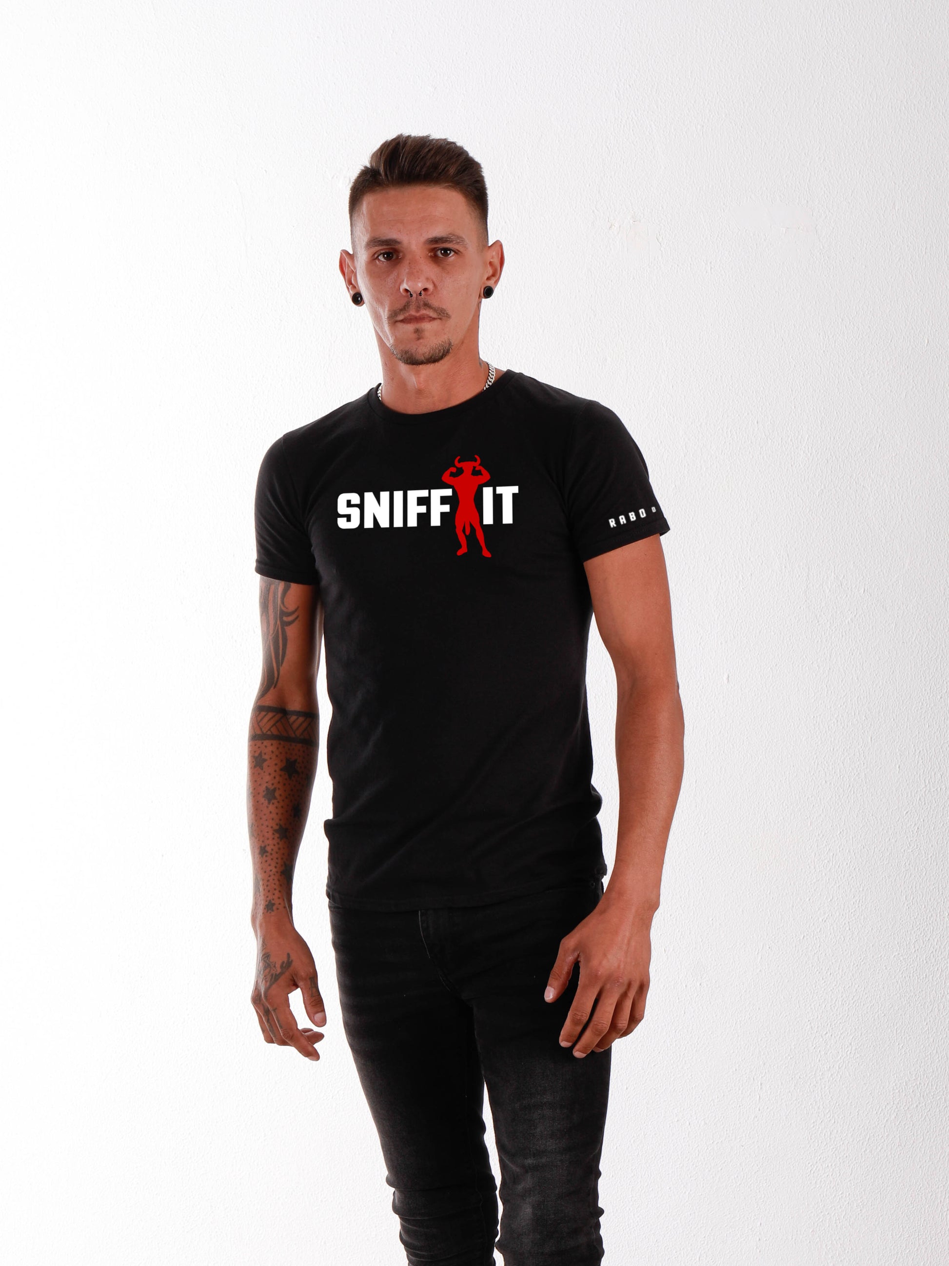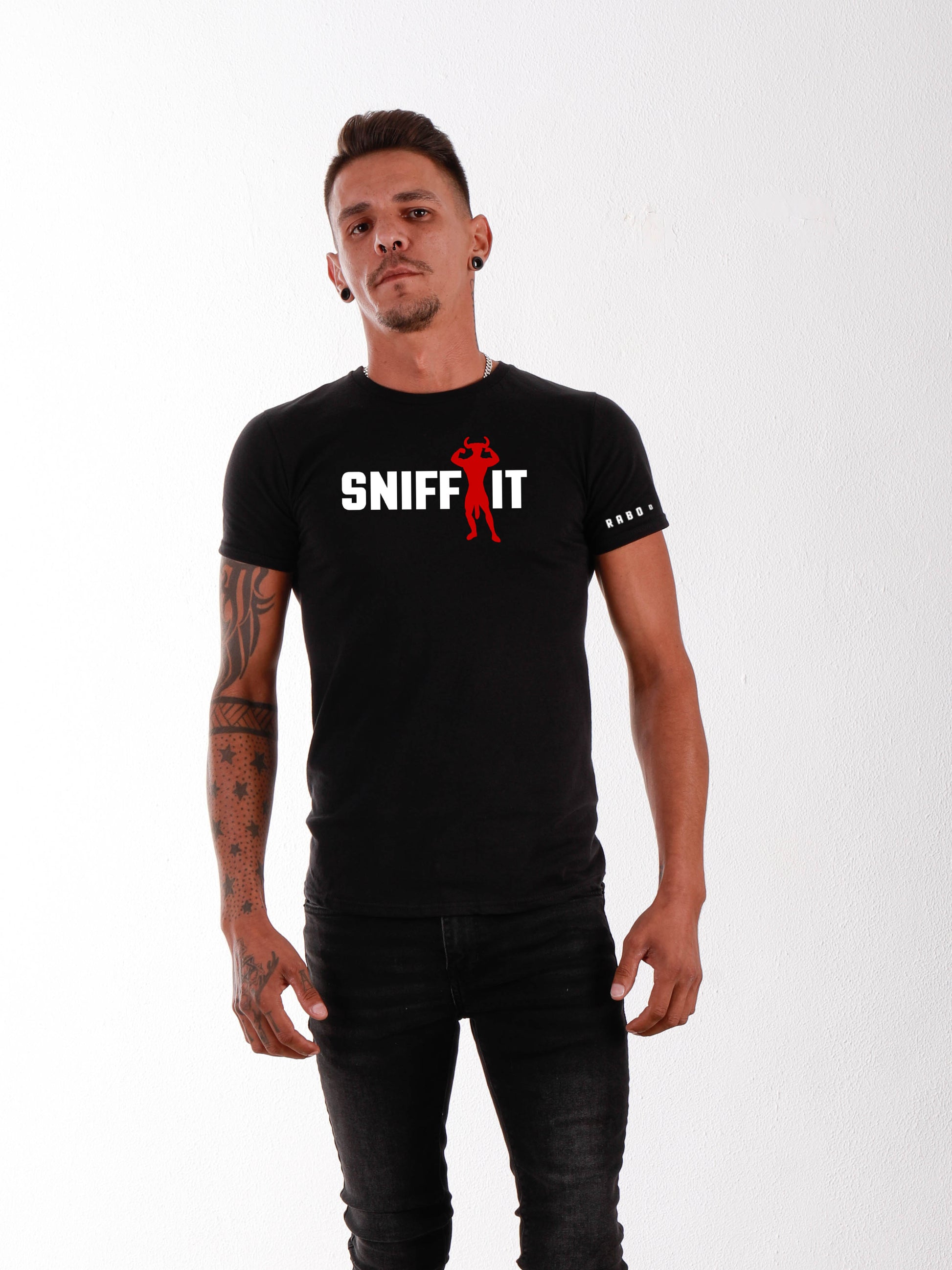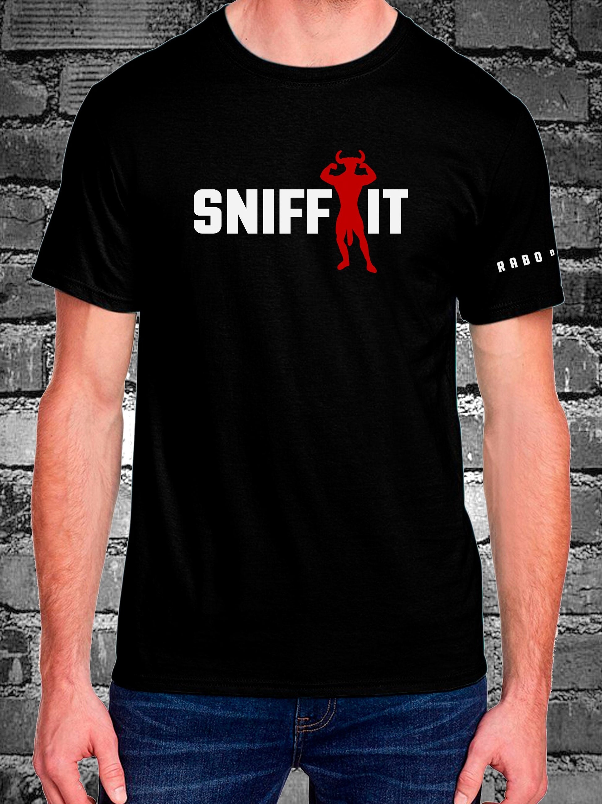 Vorne in der Mitte steht ein Minotaurus in Rot mit erhobenen Händen, um seine sexy Achseln zu zeigen, und dem Text „SNIFF IT“ in kräftigem WEISS. Weißes Rabo de Toro-Logo auf dem linken Ärmel.