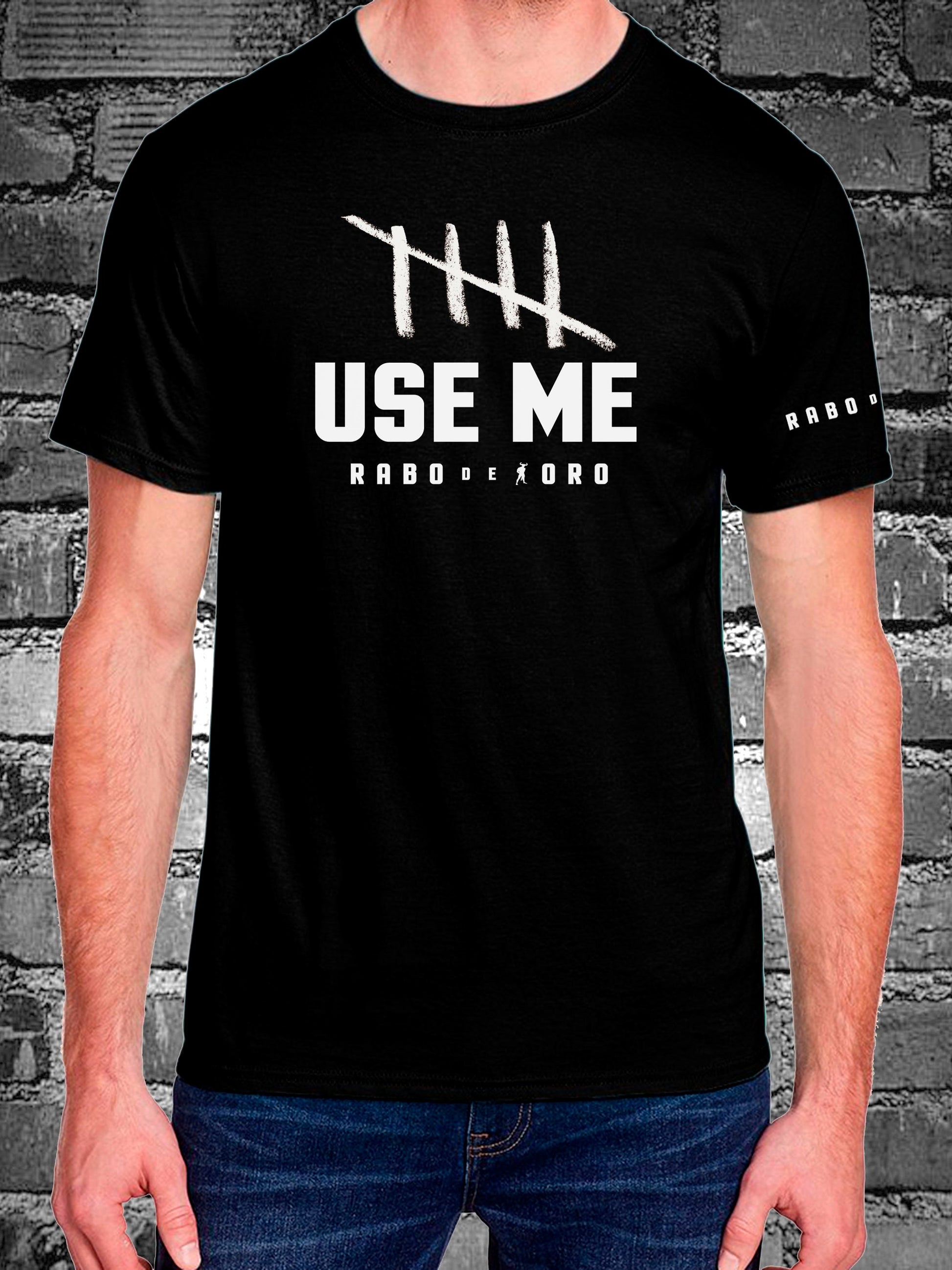 Vorne in der Mitte steht das Wort „USE ME“ in fetten weißen Buchstaben mit Tally-Marks-Design ebenfalls in Weiß. Weißes Rabo de Toro-Logo vorne in der Mitte und auf dem linken Ärmel.