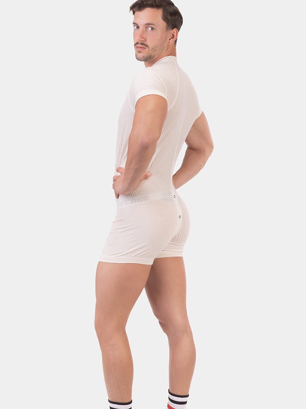 Ahora con mangas y piernas cortas, confeccionado en un poliéster canalé. Se ajusta cómodamente y solo te mantiene moderadamente caliente. La barra de botones va desde el cuello a través de la entrepierna hasta la parte superior de las nalgas. También es flexible y se puede usar debajo de su ropa diaria.