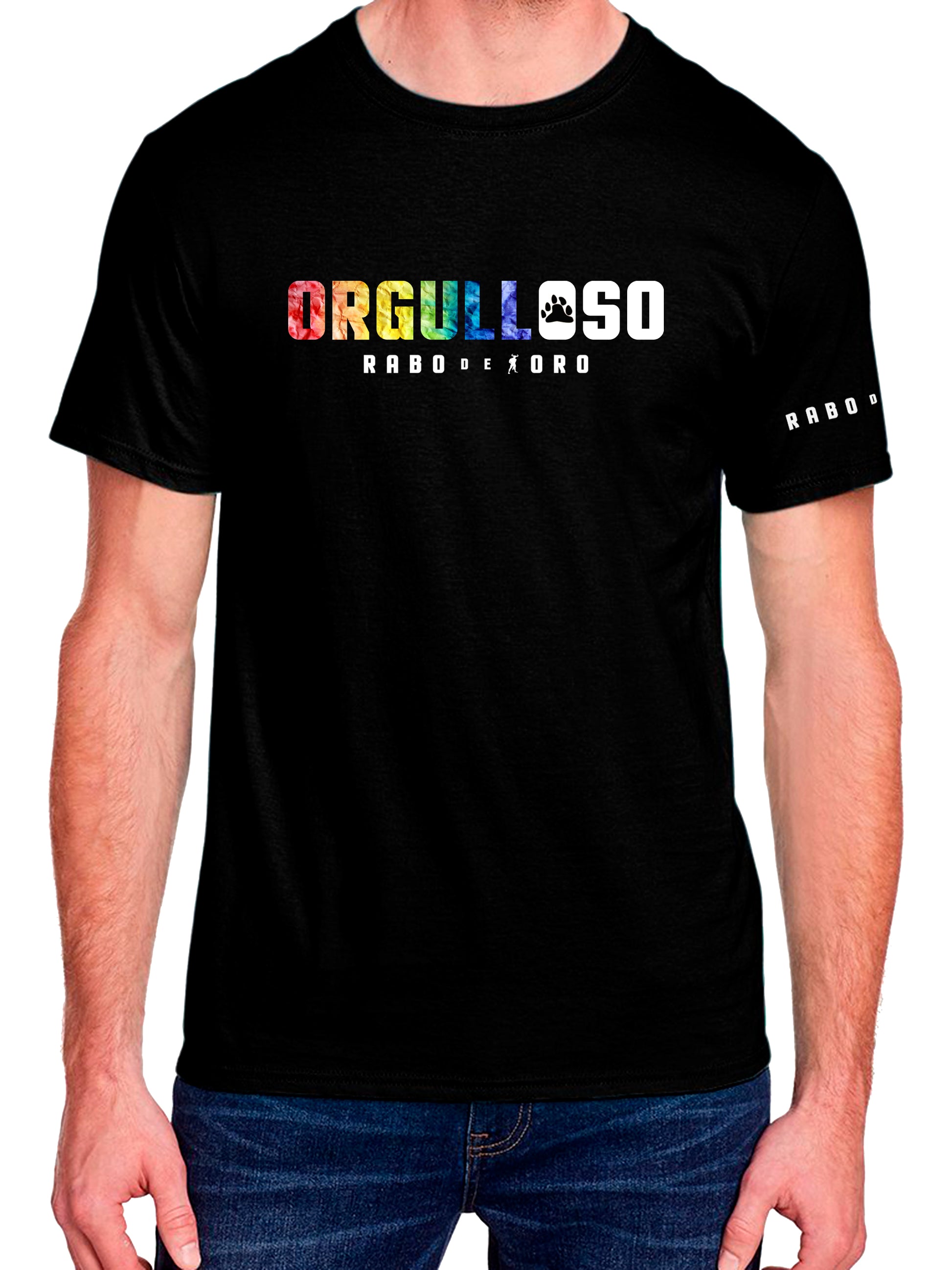 Frente Centro posicionado ORGULLOSO en letras llamativas de color arcoíris con el OSO en letras BLANCAS en contraste y un símbolo BEAR PAW negro en la primera O. Logotipo blanco de Rabo de Toro en el centro del frente y en la manga izquierda.