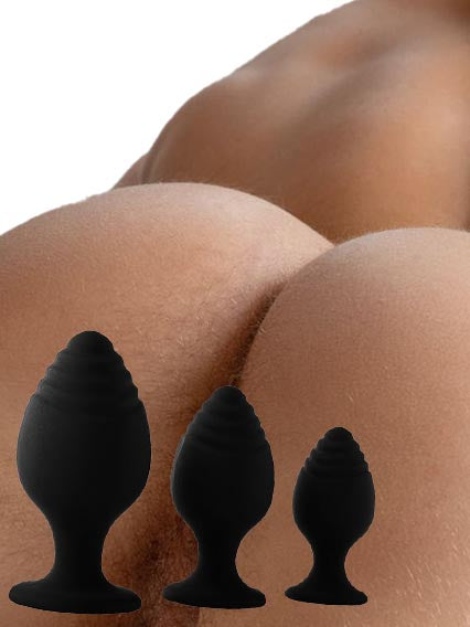 Fantástico set de entrenamiento estriado de 3 plugs anales con ventosa