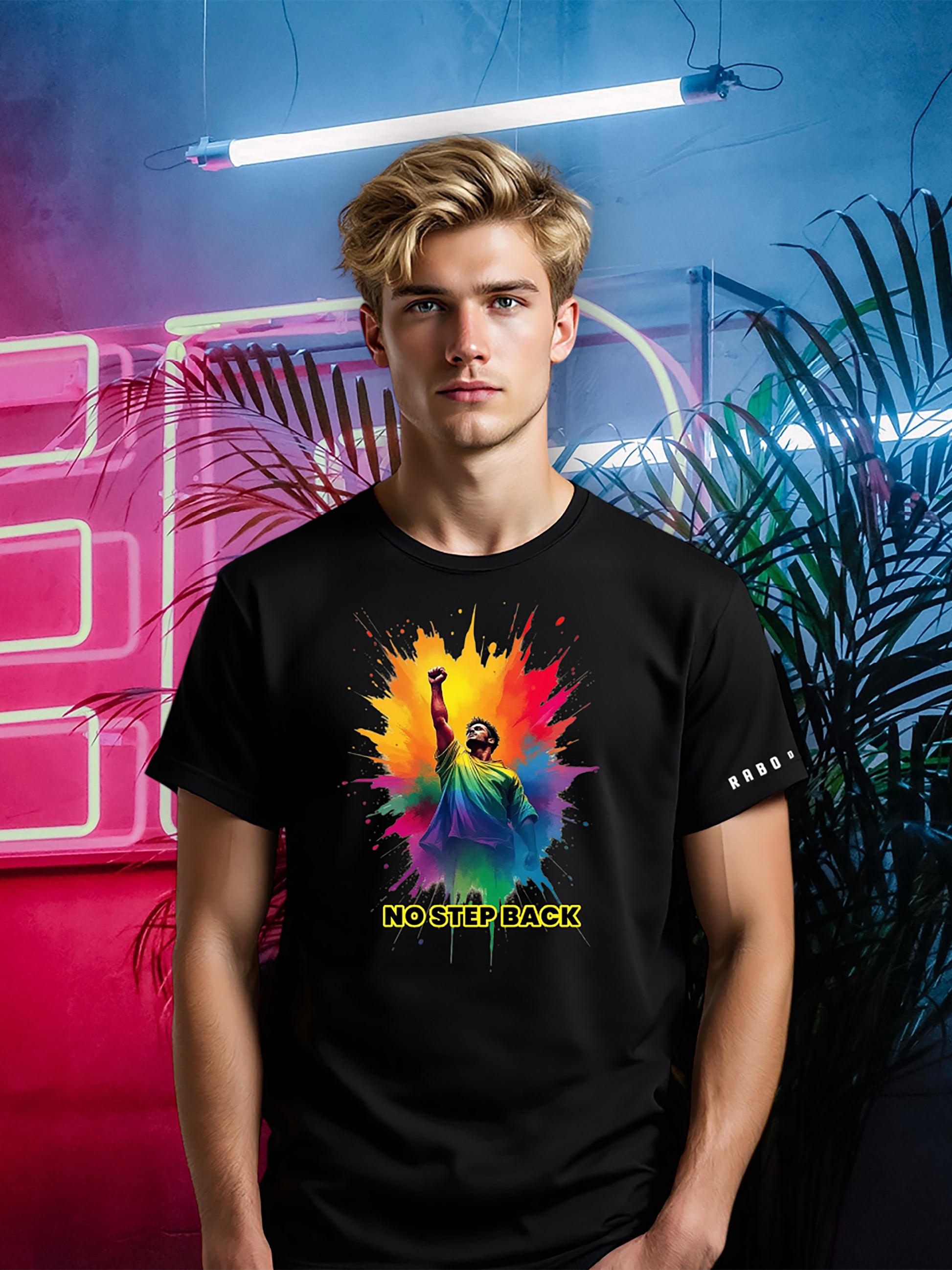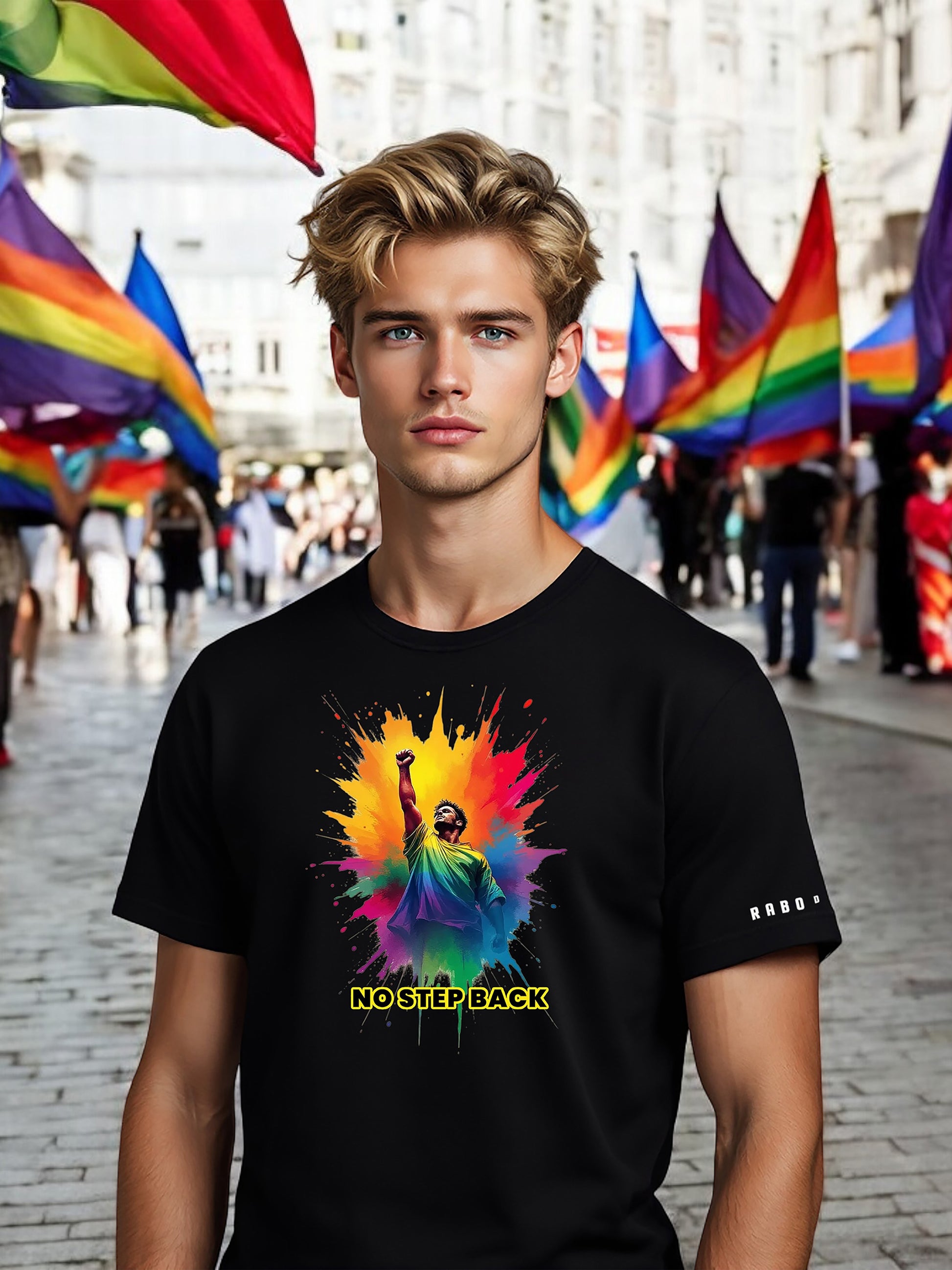 - Diseño exclusivo Gay Wear: Una llamativa imagen de un manifestante con la mano extendida, sobre una potente explosión de arco iris, acompañada del desafiante mensaje "No Step Back".