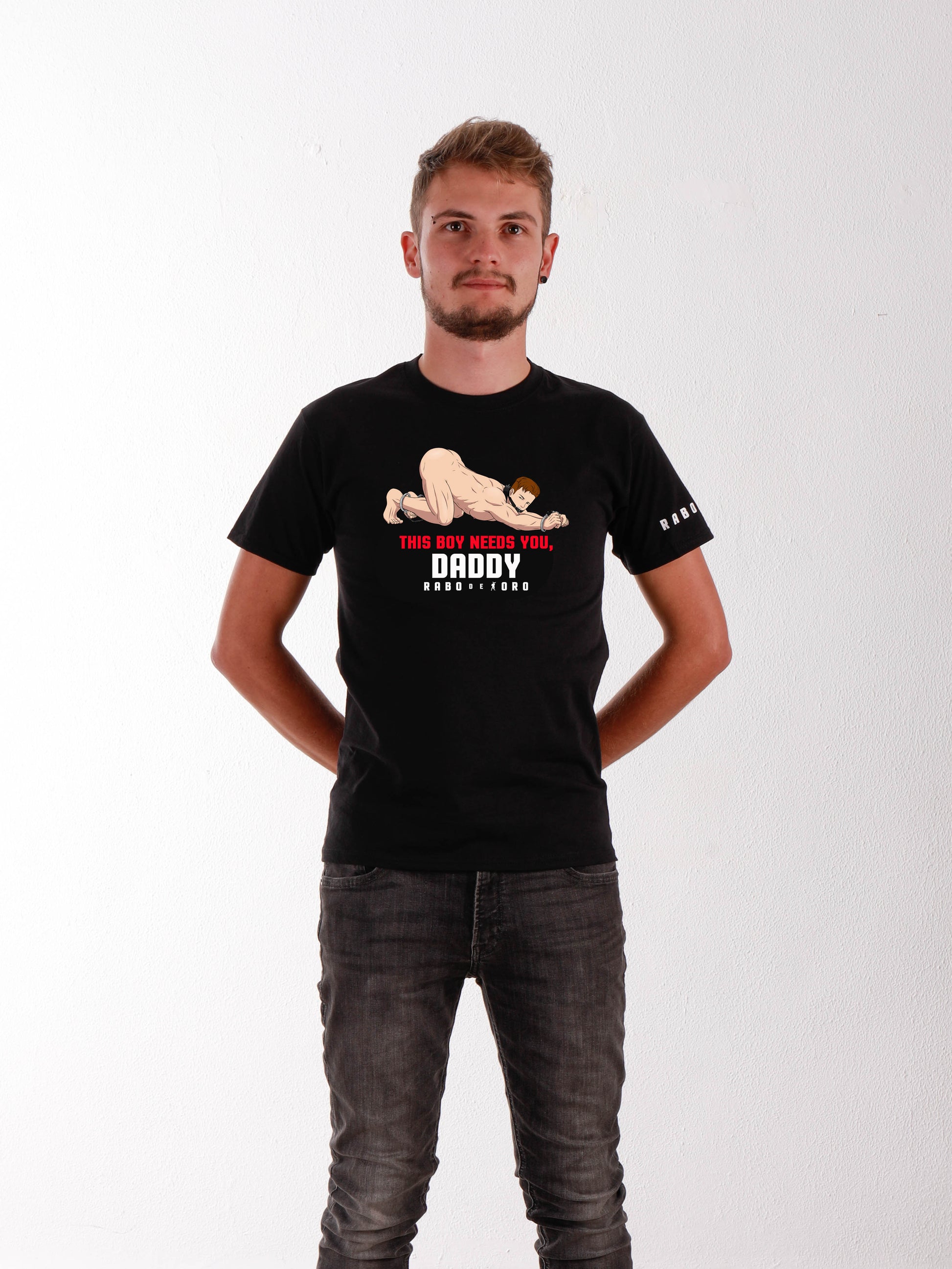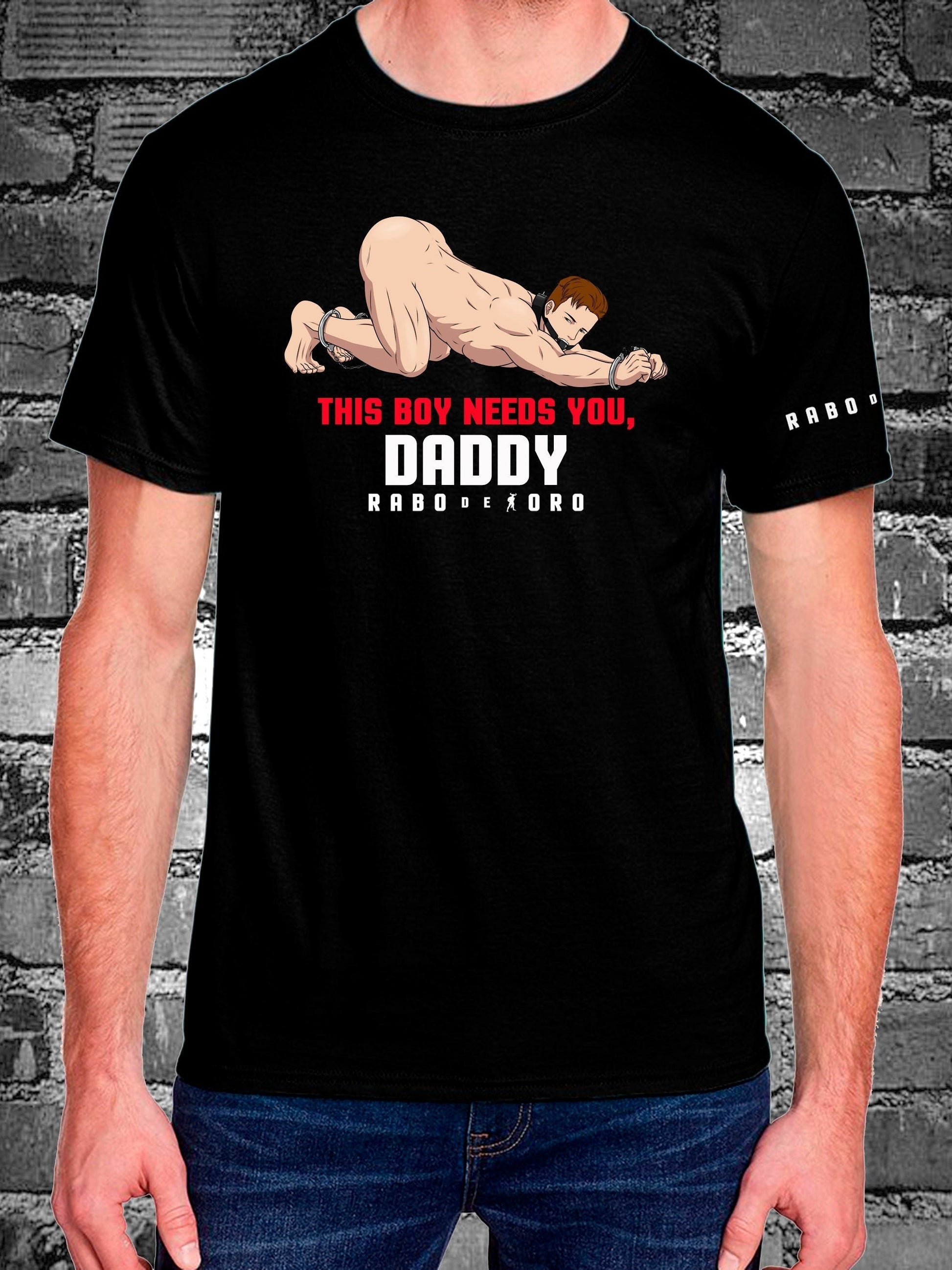 Este chico te necesita, Daddy Gay Men's BDSM Fetish Club Camiseta negra con detalle de dibujos animados Slave BOY.