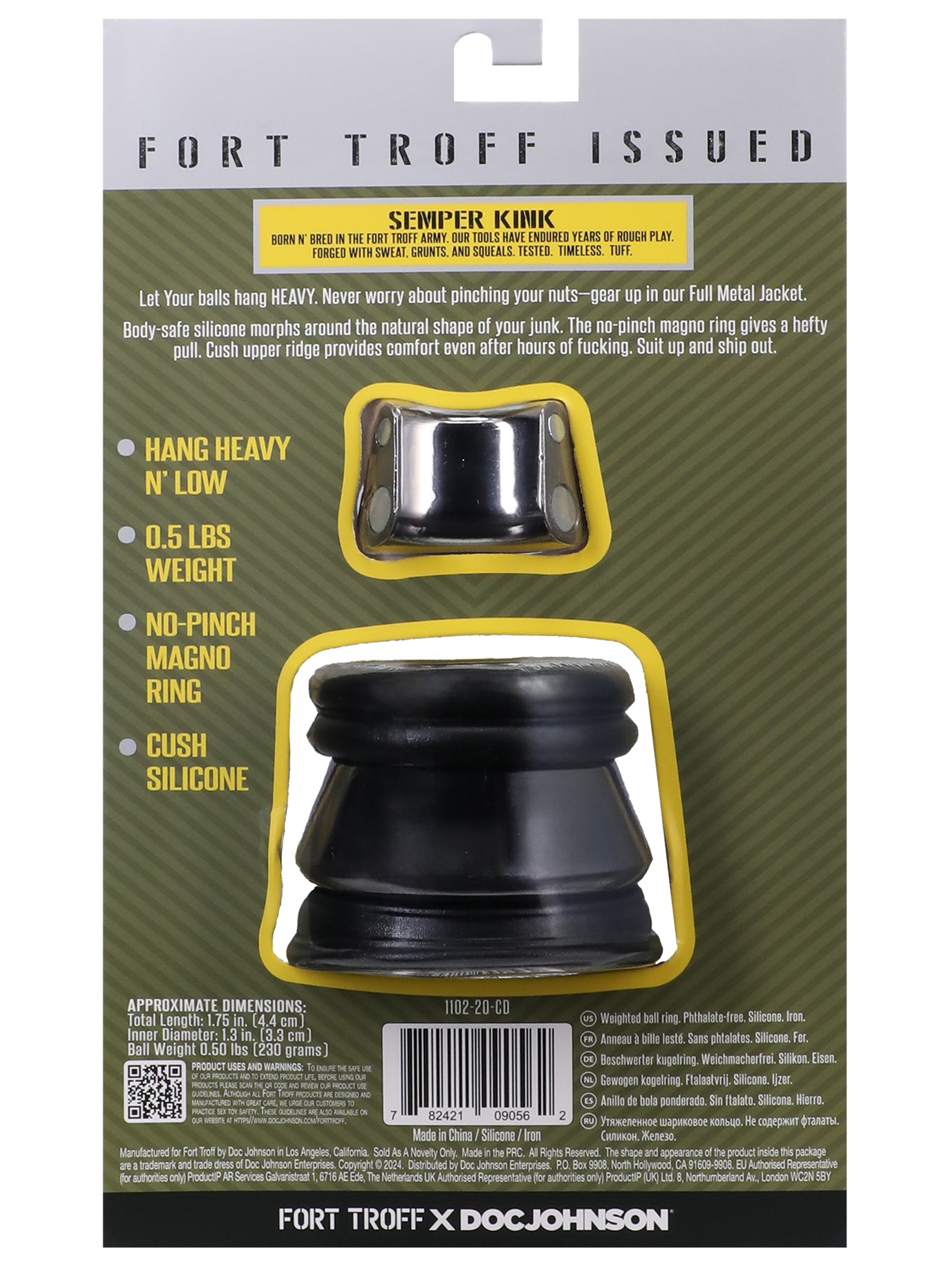 Let your balls hang HEAVY, pigs. No need to worry about pinching your nuts—gear up in the Fort Troff Full Metal Jacket - Magnetic Weighted Ball Stretcher.