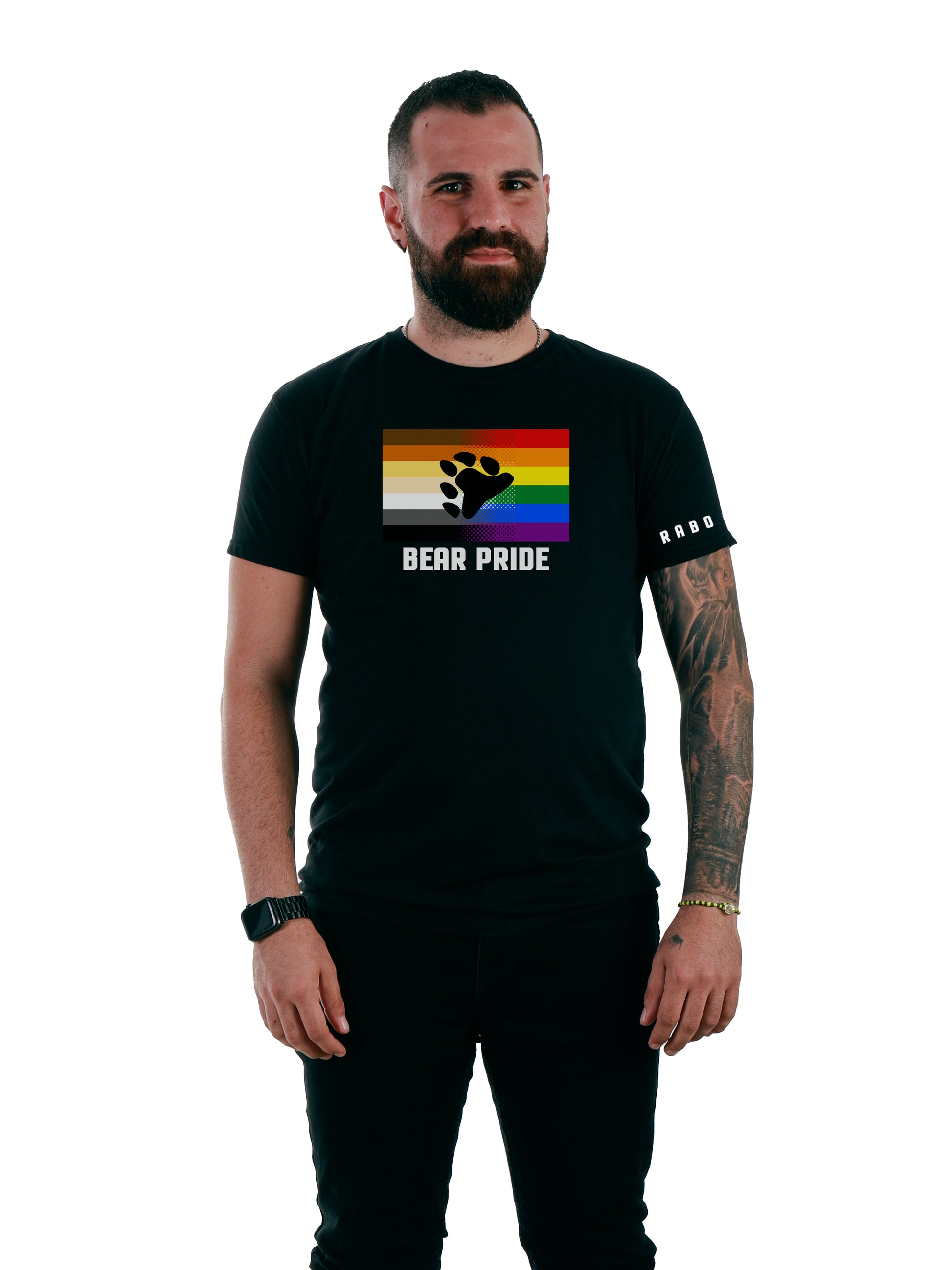 Show your pride with the RABO DE TORO BEAR PRIDE black t-shirt, blending the BEAR Pride flag and Gay/Rainbow flag. This sleek tee is perfect for flaunting your kink and queer identity with style. Get yours now and slay the scene!