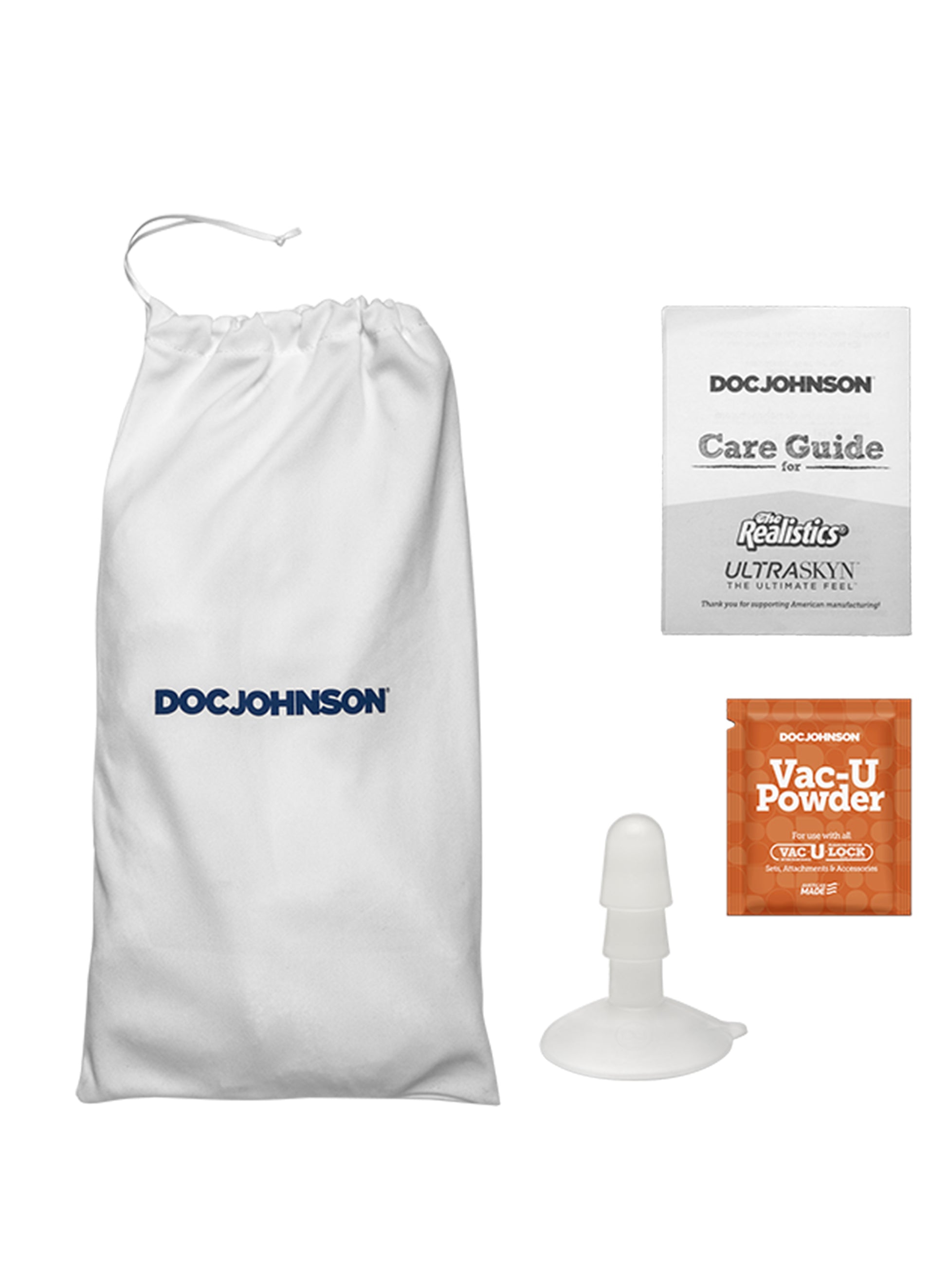 - Package contains dildo, travel bag Vac-U Powder sachet (5g) and Vac-U-Lock compatible suction cup