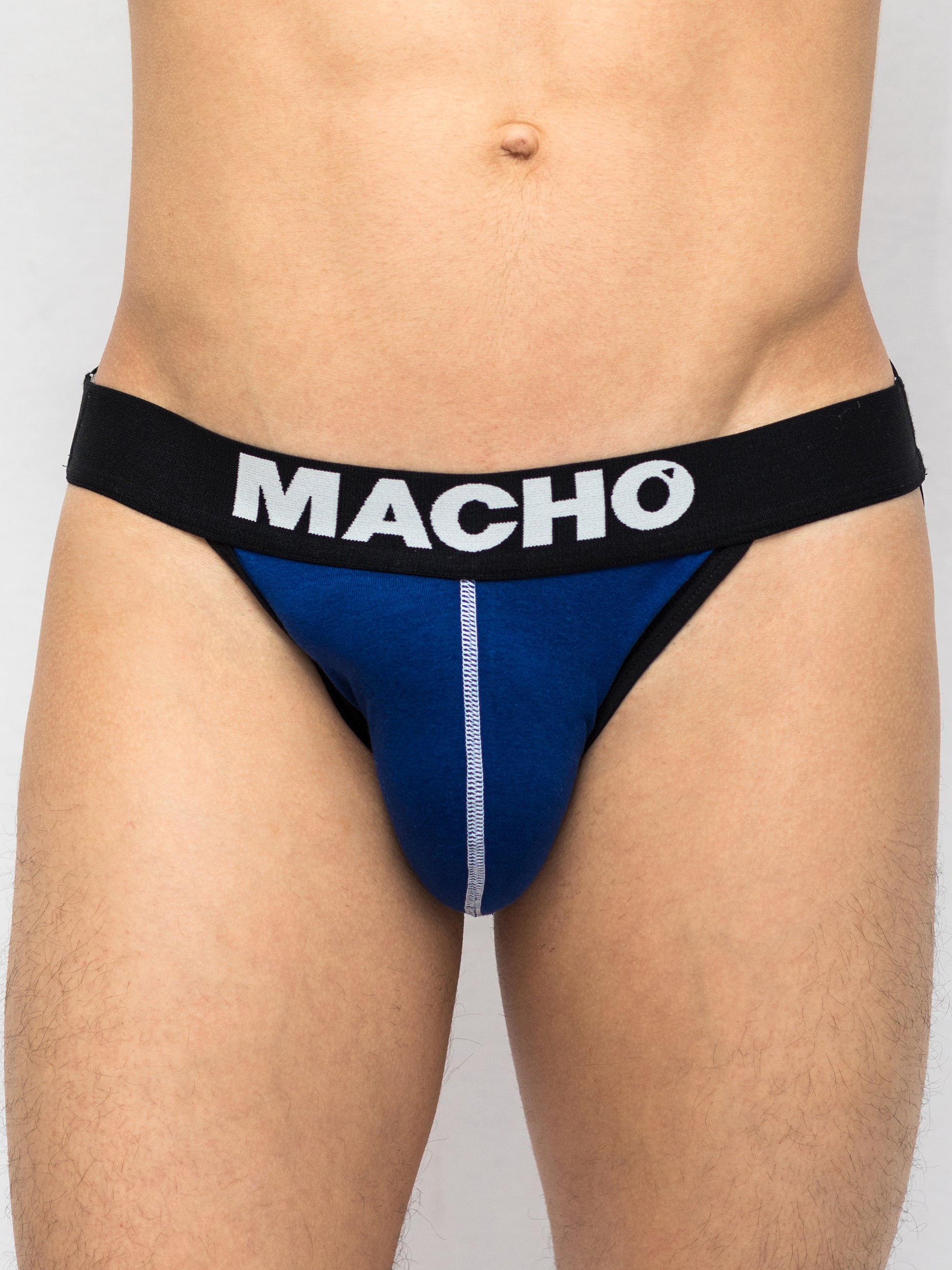 Macho Underwear Jockstrap with Blue lycra fabric, a provocative, spicy and daring soft fabric with its V-shaped cup and a contrast white stitch that highlights the bulge.