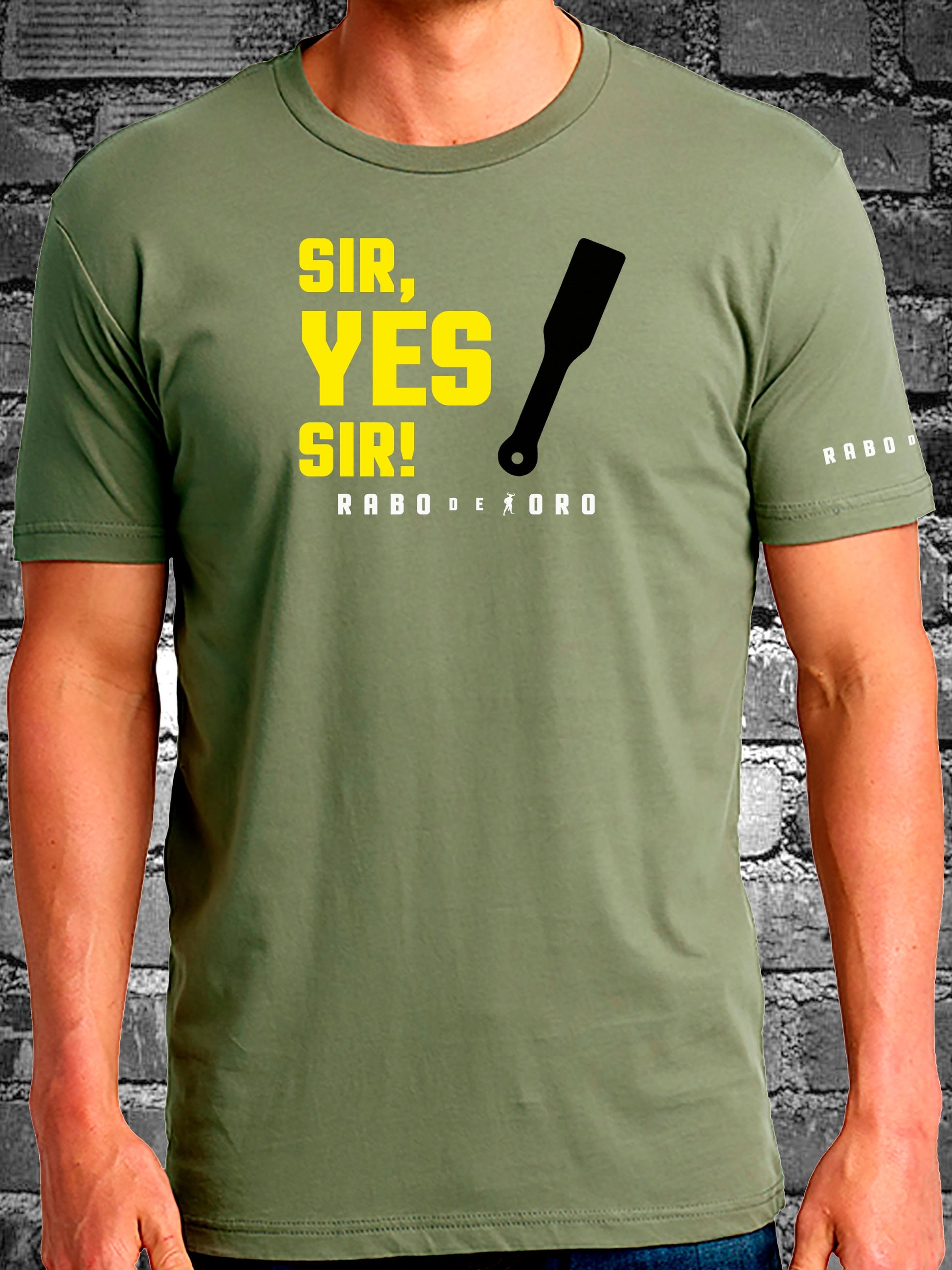 RaboDeToro - SIR, YES SIR! Gay Men's BDSM Fetish Club Army Olive T-Shirt with Spanking Paddle detail.