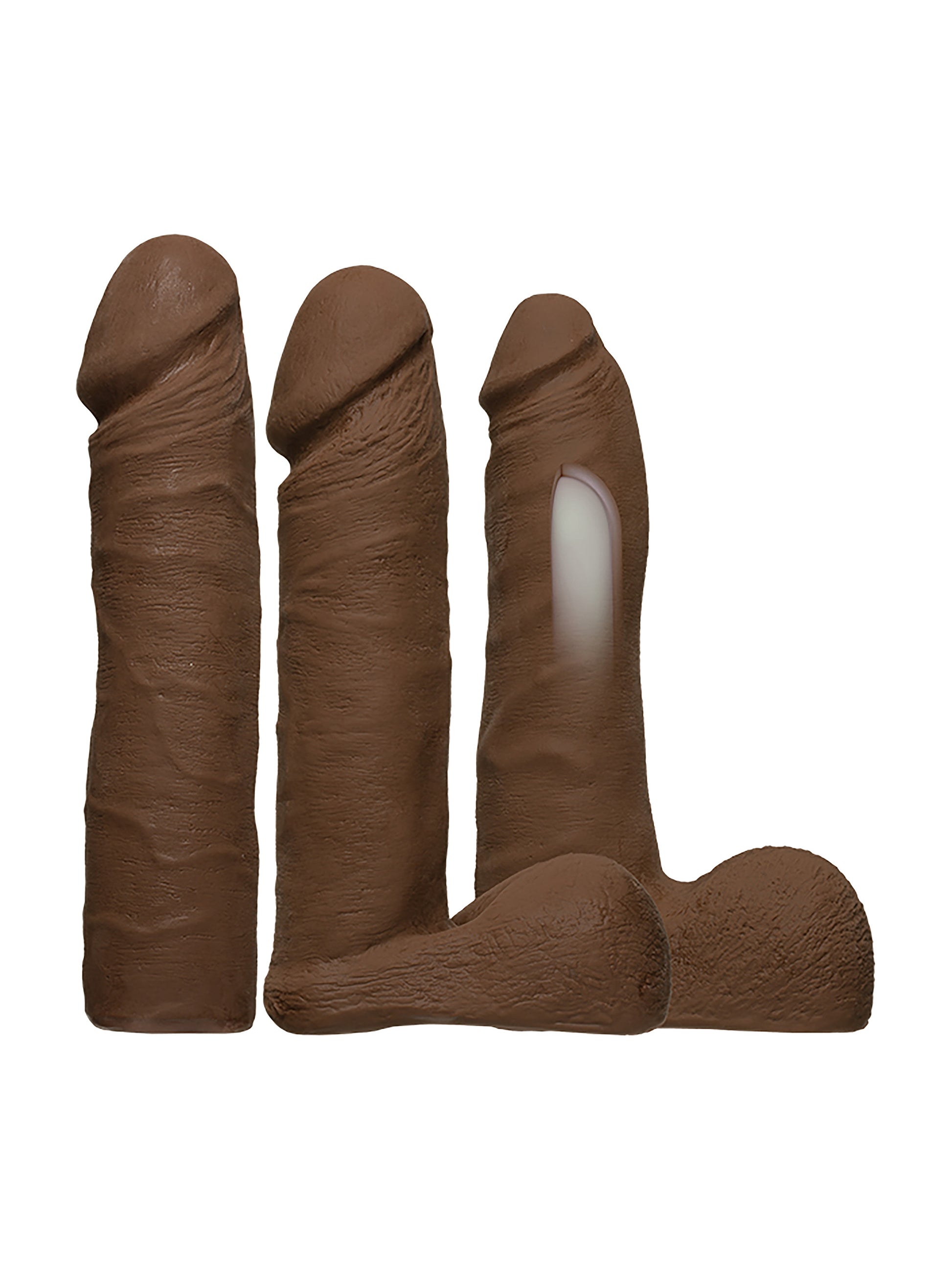 - Three ULTRASKYN™ Dual Density Realistic Dildo Attachments: Includes an 8" Realistic Dong (Dildo without balls), a 7" Cock, and the bestselling 7" Slim Cock. These lifelike, dual-density delights are handcrafted in the USA and warm to body temperature and feature a soft, pliable exterior with a firm inner core, mimicking the feel of a real erect penis.