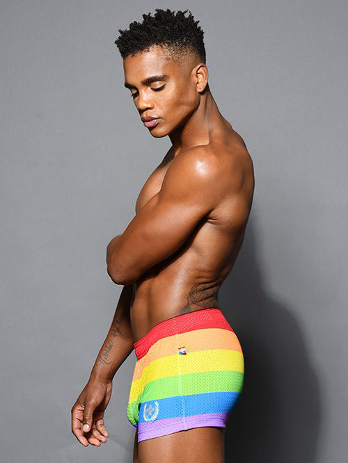 This skimpy see-thru mesh is perfect for when things get hot! Thanks to the limited edition rainbow stripe design, slimming drawstring waistband, and form-fitting cut, this will quickly become your favorite pair of shorts.